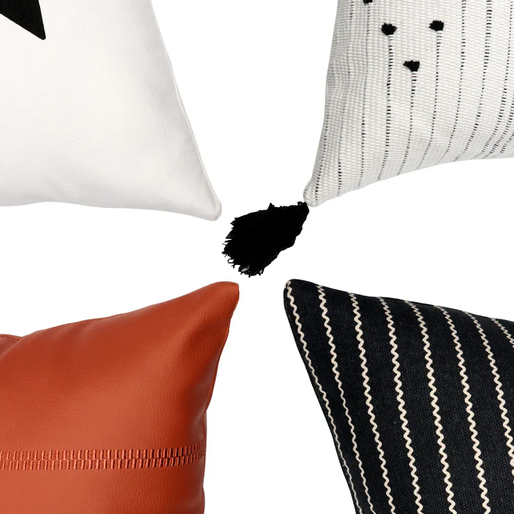 Стиль 1: однотонный хлопковый материал, геометрические узоры Стиль 2: лицевая сторона-хлопковая ткань с набивным рисунком, задняя сторона-сплошной хлопок, ручная отделка/кисточки Стиль 3: тканая хлопковая нить, мягкая и пушистая Стиль 4: искусственная кожа, машинная стирка
