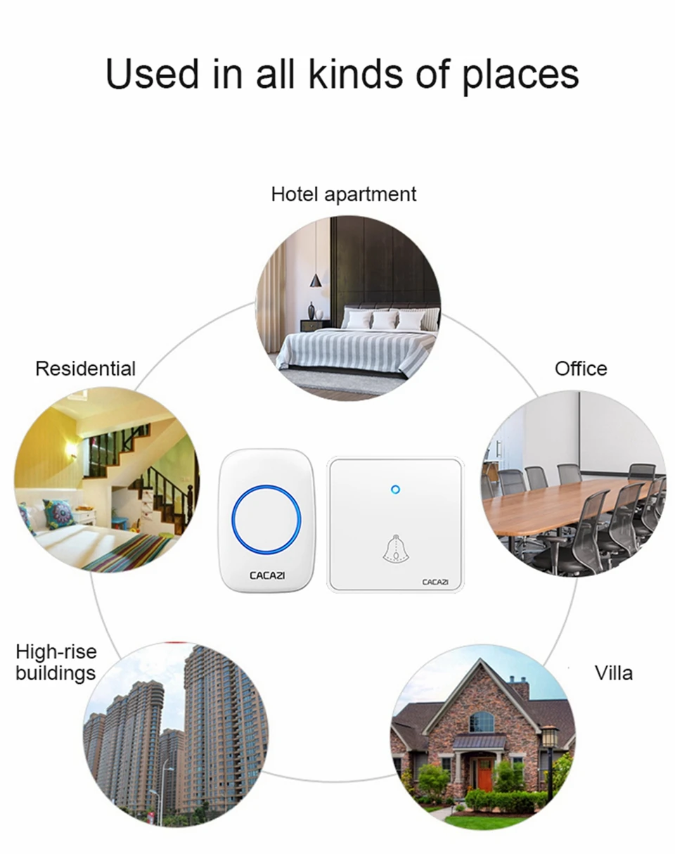 1. Кнопка поддерживает до 8 шт., а приемник поддерживает до 100 шт. 2. Если несколько кнопок сопряжены с одним или несколькими приемниками в одной системе, каждая кнопка может быть настроена на другой мелодию звонка. 3. Функция отключения питания: Включите питание снова после выключения питания, нет необходимости повторно регулировать и блокировать мелодию звонка. 4. Передатчик не имеет винтового зажима, и он может быть водонепроницаемым и пыленепроницаемым без резинового кольца. 5. Передатчик использует щелочную батарею CR2032 (не входит в комплект). 6. Напряжение приемника: 110-240 В. 7. Приемник доступен в различных вилках, США/ЕС/Великобритании Вилка и AU адаптеры, подходит для большинства стран. 8. Расстояние приема: 300 м на открытой местности. 9. На беспроводной сигнал будут влиять препятствия. Чем больше препятствий, тем тяжелее потеря сигнала. 10. Приемник имеет 5 уровней (может быть отключен) 0-110 дБ, 60 музыки на выбор. 11. Размер: передатчик 86x86x10 мм, приемник 95x65x24mm. Примечание: Кнопка не может быть размещена на железной двери, потому что это будет мешать сигналу.
