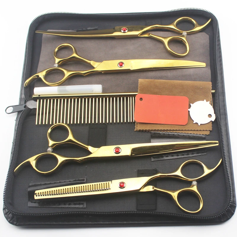 Set include : 1 piece 7 '' cutting scissor 1 piece 7 '' up curved cutting scissor 1 piece 7 '' down curved cutting scissor 1 piece 6.5 '' thinning scissor 1 piece steel comb 1 piece case Customize logo/name : YES (free) Laser engrave words : YES (free)