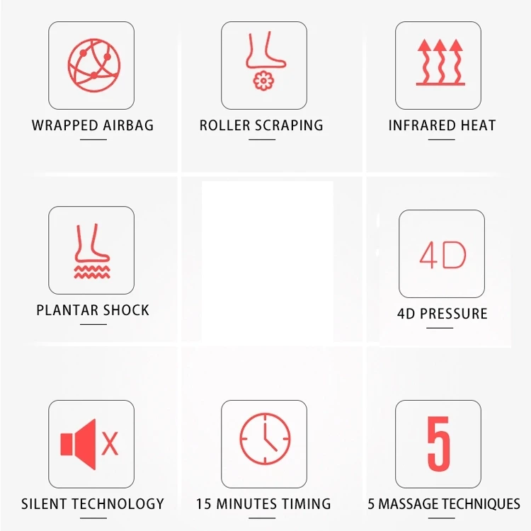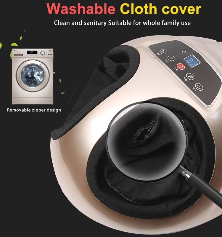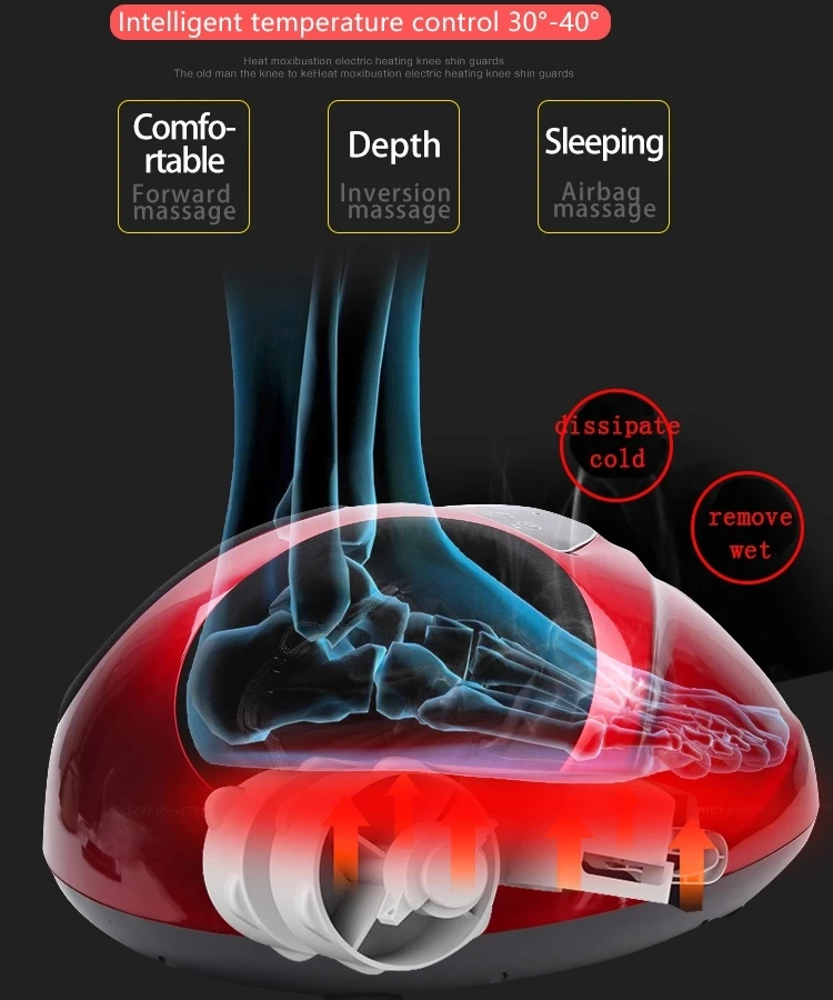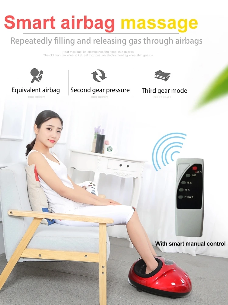 Этот продукт имеет новый внешний вид и изготовлен из тонкой ткани. Точная акупунктурная массажировка ног дает Вам комфортный опыт. Он может переносить эмуляцию для лица, нажимая на палец, разминающий и роликовый Тип ручного массажа. Пневматическая подушка безопасности является более внимательным, один ключ, чтобы начать с инфракрасного горячего сжатия. Чехол из дышащей ткани можно заменить и постирать водой. Продукт управляется беспроводным управлением и может использоваться во времени. Управление температурой простое и удобное. На ваш выбор три цвета: золотой, черный и красный. Номинальная мощность: 50 Вт Номинальное напряжение: 220 В Номинальная частота: 50 Гц Вес продукта: 4,5 кг Размер изделия: 43*36*22 см Размер упаковки: 44,5*37,5*24 см