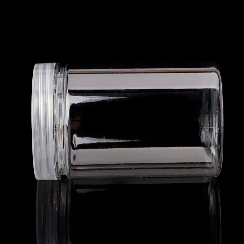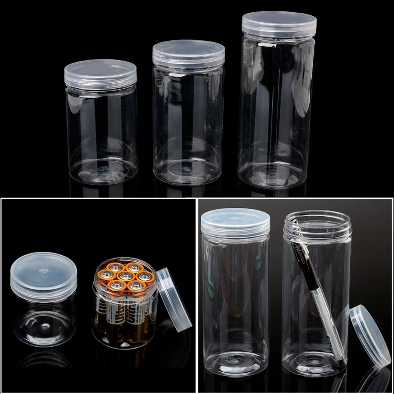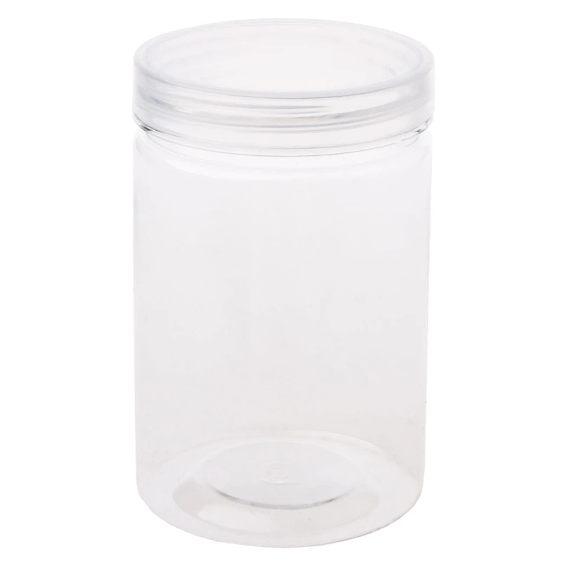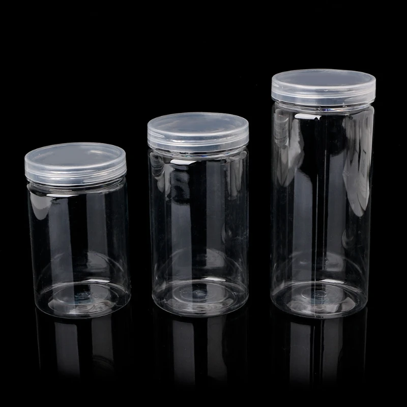 Это круглые пластиковые банки (ПЭТ) с гладким прозрачным винтом на крышках. Эти многоразовые контейнеры поставляются с прозрачными крышками.