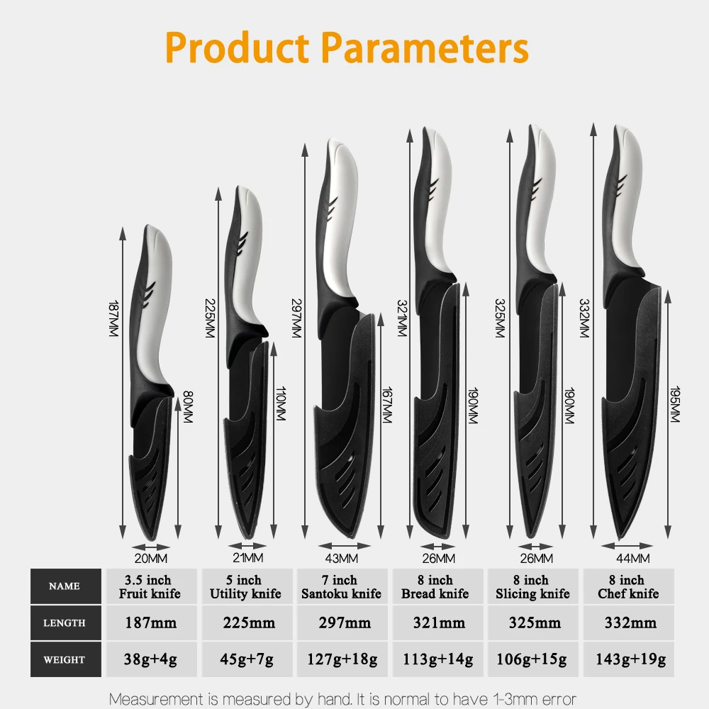 1. Пожалуйста, не помещайте в посудомоечную машину. 2. Пожалуйста, держите его подальше от детей. 3. Пожалуйста, не держите край и точку ножа нацелены на людей. 4. Пожалуйста, не ловите нож вручную, когда нож опускается. 5. Пожалуйста, очистите и высушите нож после использования и поместите его в сухое место. 6. Лезвие очень острое, пожалуйста, не используйте палец, чтобы проверить остроту ножа. 7. Из-за ручного измерения размер и вес продукта могут иметь небольшую погрешность.