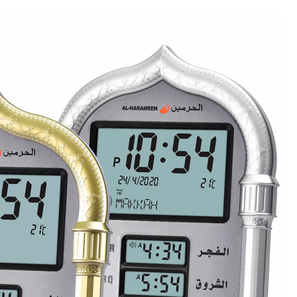 Характеризуется AL-HARAMEEN часами с высоким качеством звука Azan для всех молитв с регулятором громкости azan, установленным на всех моделях часов.
