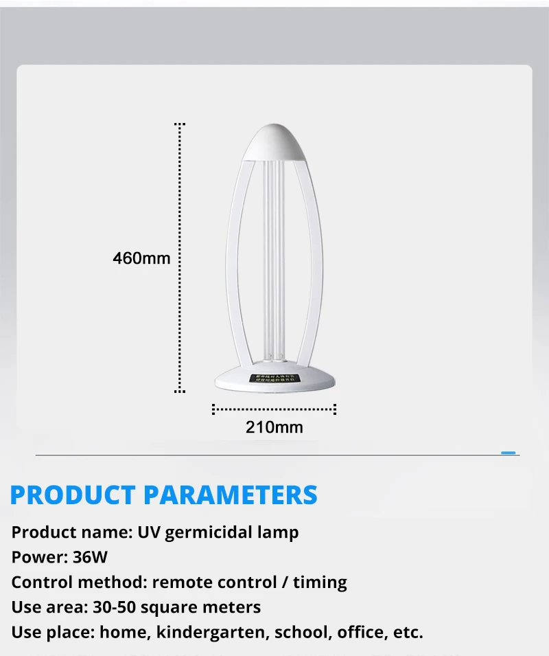 Тип: настольная УФ-лампа для стерилизации Цвет: как показано на рисунке Количество: 1 шт. Материал: АБС-пластик Вилка: зарядное устройство вилка Мощность: 58W Длина волны лазера: 254nm Напряжение: 220V • Сила тока: 0,32 A Длина кабеля: 1,5 м Размер: 21*11*46 см/8,25*4,32 * 18.08in Вес нетто: 200 г/7,05 унций