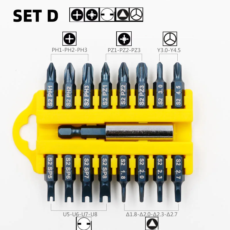 Набор D: Phillips: PH1-PH2-PH3 Pozidriv: PZ1-PZ2-PZ3 Y-образный: 3,0-4,5 Гаечный ключ: SP5-SP6-SP7-SP8 Треугольник: 1,8-2,0-2,3-2,7