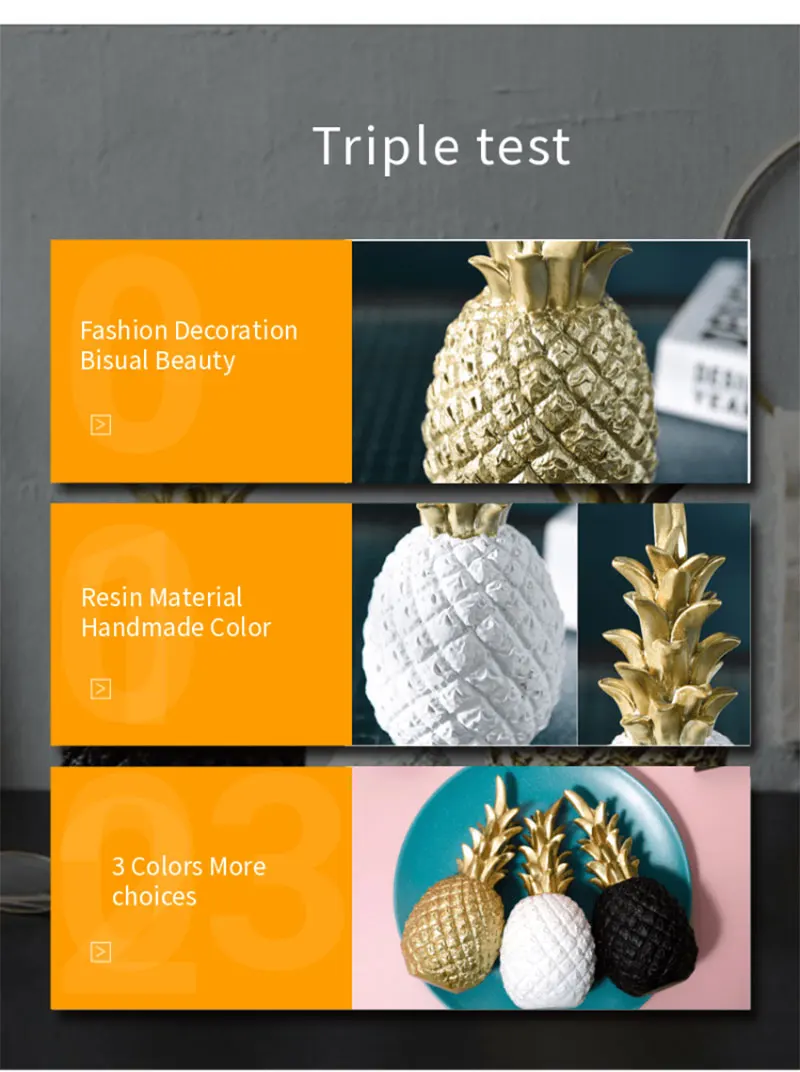 Это новый Ссылка для вас дешевле, чем раньше Ограниченное количество Https:/item/1005001803791664.html? Характеристики: Цвет: Золотой/черный/белый Размер: 150*70 мм/200*90 мм/250*110 мм/250*110 мм/135*80 мм Материал: смола Количество: 1 шт. Посылка включает в себя: 1 * Декор ананаса Особенности: 1. Прочный Материал: изготовлен из высококачественной смолы, декор прочный, нетоксичный. 2. Подарок: Это милое украшение в виде фруктов-отличный подарок для ваших друзей и семьи. Идеально подходит для празднования праздников, дней рождения и многого другого. 3. Домашний декор: идеально подходит для размещения на столах, комодах или столешницах в комнате. Примечания: 1. Пожалуйста, учитывайте разницу в 1-3 мм из-за ручного измерения, спасибо за понимание! 2. Из-за разницы между различными мониторами, пожалуйста, поймите, что изображение может не отражать фактический цвет товара.