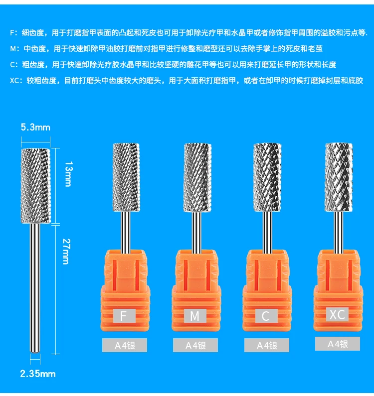 1. Стойкость к воздействию кислот, щелочей и тепла. Высокая стойкость к истиранию. Плавное вращение без тряски. Не повреждает пальцы. 2. Несколько зубчатых колес и несколько цветов на выбор, отвечают различным потребностям дизайна ногтей. 3. Сверла изготовлены из керамики, хвостовик изготовлен из вольфрамовой стали, не ржавеет. 4. Диаметр шлифовального хвостовика составляет 2,35 мм, подходит для большинства электрических маникюрных машин на рынке. 5. Многократное использование, подходит для обрезки кристальных ногтей и фототерапии ногтей, может легко удалить более толстые уплотнения, чтобы предотвратить остатки вещества.