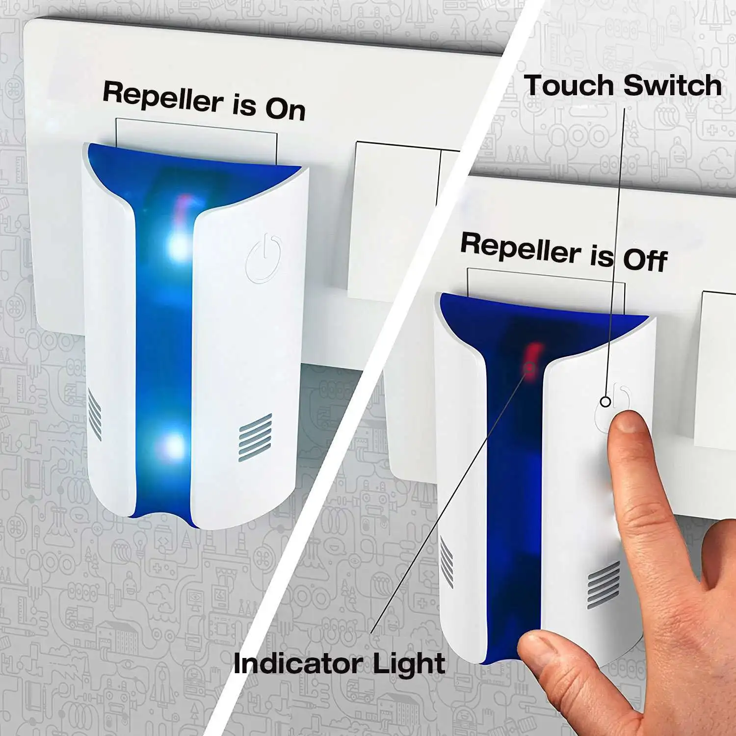 С мощным sonic, он может эффективно отталкивать комаров, насекомых и мышей.