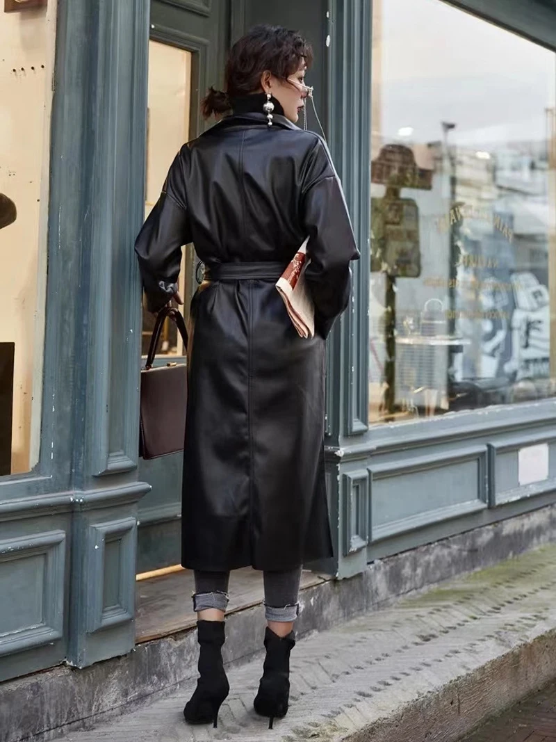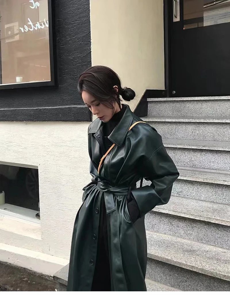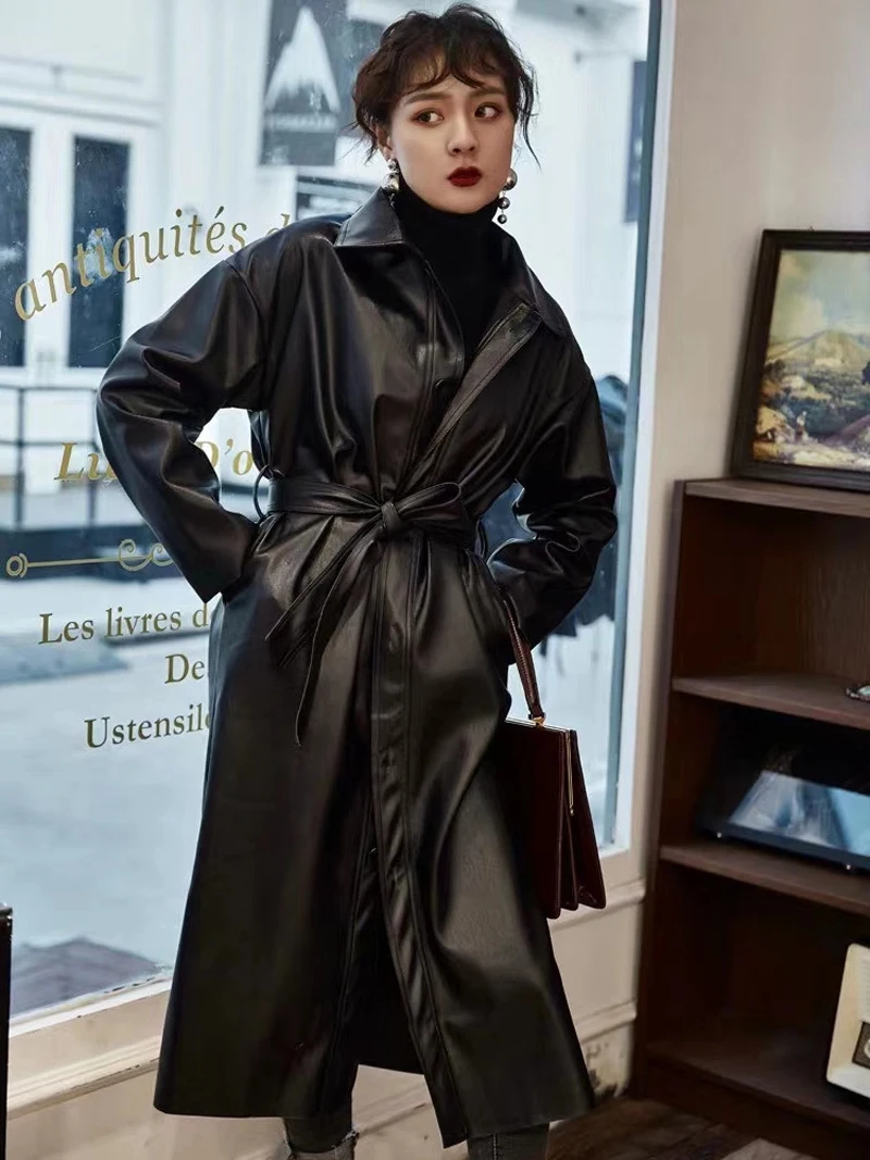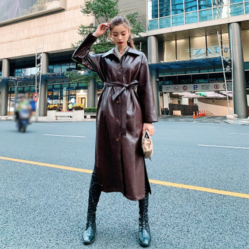 Крутая длинная куртка из искусственной кожи, новинка весны 2020, женский свободный пояс, Ветровка из искусственной кожи, плащ, тонкая осенняя куртка NS939a