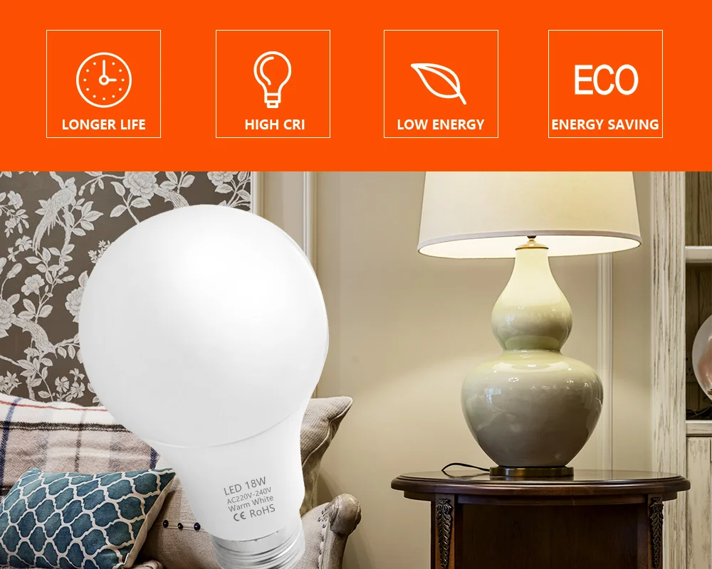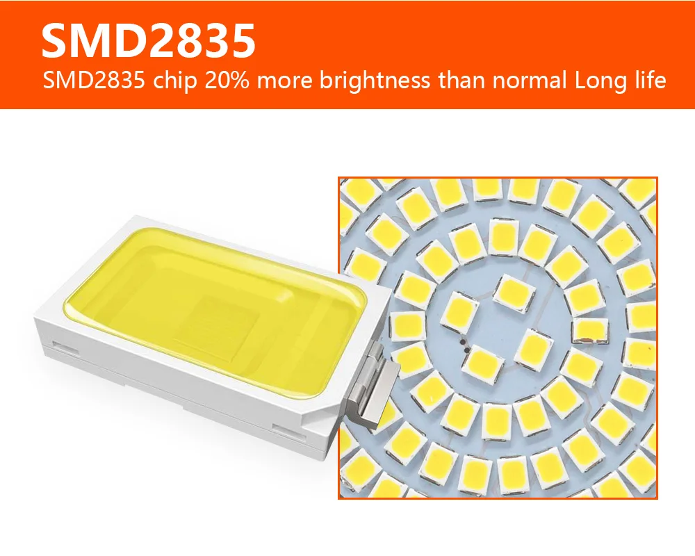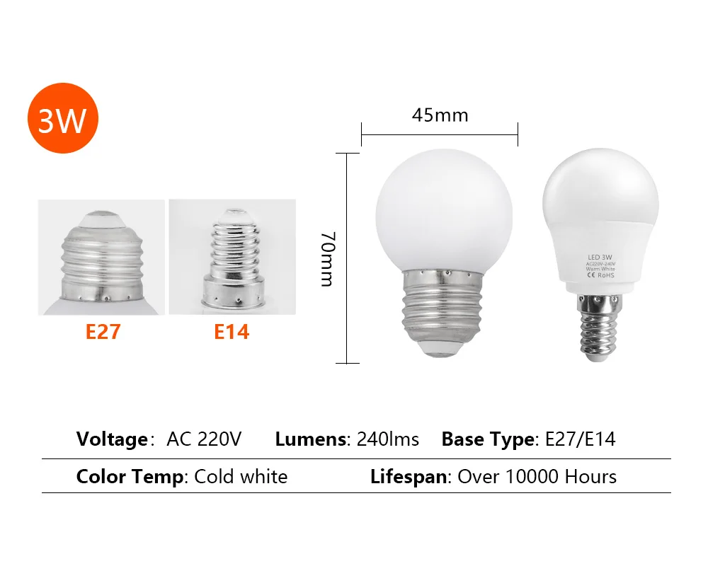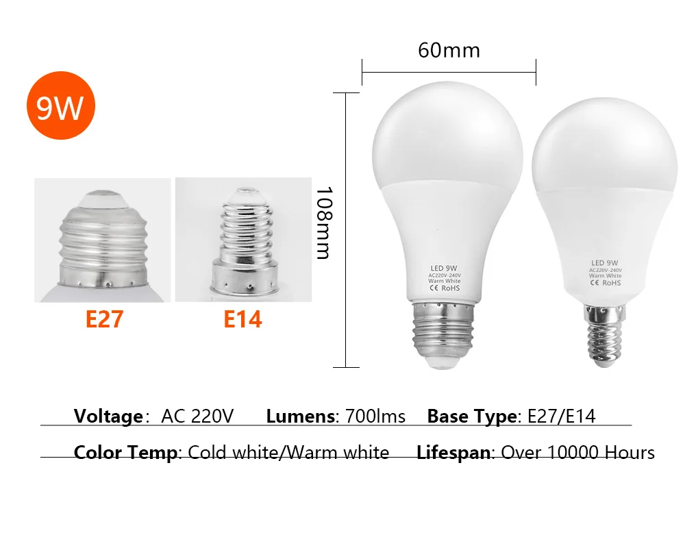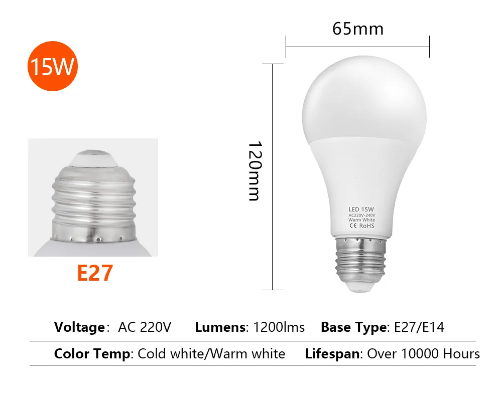 Мощность: 3 Вт 6 Вт 9 Вт 12 Вт 15 Вт 18 Вт Напряжение: 200-240 В переменного тока (200 в 210 в 220 В 230 в 240 В) Основание: 3 Вт 6 Вт 9 Вт: E14 E27 ; 12 Вт 15 Вт 18 Вт: E27 Светодиодный чип: SMD2835 Индекс цветопередачи:>80 Цветовая температура: холодный белый 6000-6500K/теплый белый 2900-3200K Угол луча: 270 градусов (Чип на плате) Срок службы: 10000 часовХарактеристика: