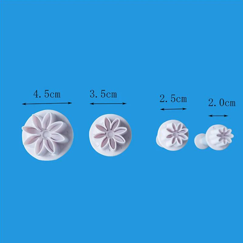 Он будет держать форму в течение многих лет. Держите его подальше от огня, газовой печи и ножа Описание продукта: Легко моется с мылом и водой. Высокое качество и 100% пищевой пластик Материал не сохраняет запахи или вкусы Легко использовать и быстро чистить Подходит для украшения торта, помады Использование: помадка/глина/мыло/шоколадная форма Размеры: Дейзи: 2 см, 2,5 см, 3,5 см, 4,5 см /Перевод единиц измерения: 1 см = 0,39 дюйма/1 дюйм = 2,54 см Посылка включает в себя: 4 шт формы для торта (другие аксессуары на фото не включены.) * Примечание: Допускается погрешность в 1-2 мм из-за ручного измерения. Из-за разницы между различными мониторами, есть различия в цвете, пожалуйста, выберите реальный продукт в качестве стандарта.