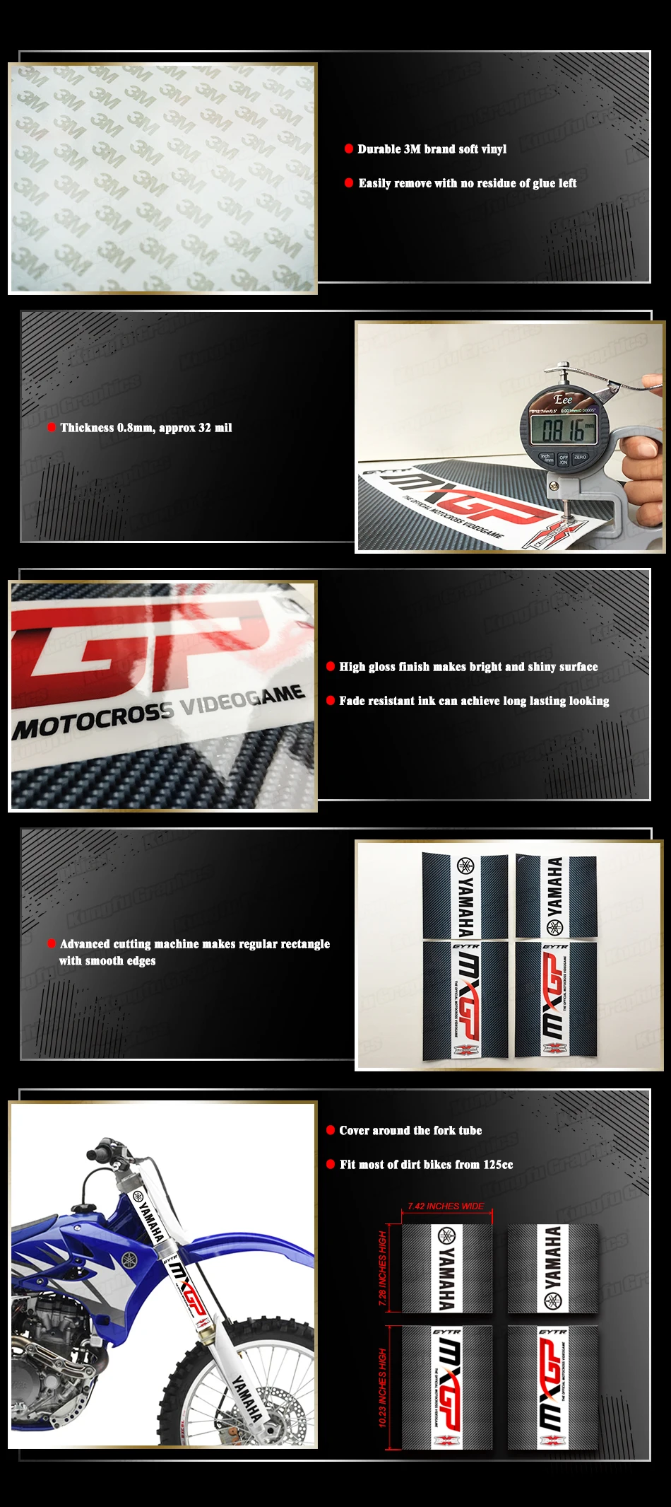 Совершенно новый верхний средний вилка пробки протектор Наклейка Комплект ● Всего 4 листа наклейки в посылка ● Размеры 7,42x7,28 Дюймов для верхней части, 7,42x10,23 дюймов для средней высоты ● Передняя вилка подвеска Украшение, вилка крышка защита графика ● Доступны для многих мотоциклов для мотокросса и эндуро, таких как Kawasaki, Suzuki, Honda, KTM, Yamaha, Husqvarna, Husaberg, Aprilia, Beta, Gasgas, BMW и т. д. Пожалуйста, свяжитесь с нами, если вы также заинтересованы в внедорожных вилках