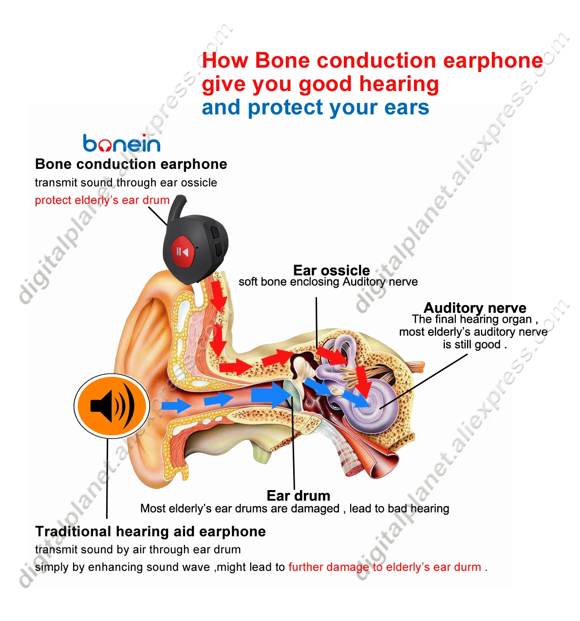1. Слуховой нерв-это последний слуховой орган. 2. Ушной барабан получает звуковую волну и передает слуховой нерв. Большинство слуховых барабанов пожилого возраста повреждены, что приводит к плохим слухам. 3. Ушные раковины-это мягкий слуховой нерв. Вибрация ушной раковины также может передавать звук слуховому нерву. (По костной проводимости наушников) Большинство слуховых барабанов пожилого возраста повреждены, что приводит к плохим слухам. Однако слуховой нерв-это последний слуховой орган, слуховой нерв большинства пожилых людей все еще хорош. Слуховой нерв закрыт ушной раковиной. Наушники с костной проводимостью передают звук через Ушную раковину вместо барабана. Он может Защитите ушной барабан для пожилых людей и Обеспечьте хороший слуховой аппарат для пожилых людей. Традиционные наушники с слуховым аппаратом передают звук по воздуху через ушной барабан, просто усиливая звуковую волну, это может привести к дополнительным повреждениям ушных вкладышей для пожилых людей. И пожилым людям становится все более и более раздраженным и болезненным, нося традиционные слуховые аппараты. Наушники с костной проводимостью-это инновационный и здоровый слуховой аппарат для пожилых людей.