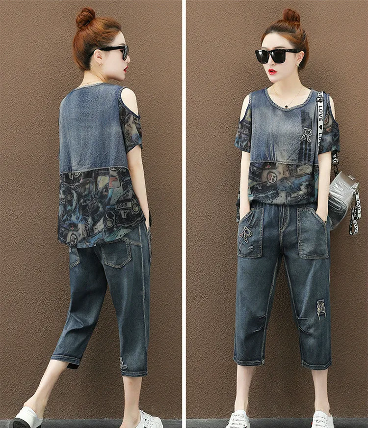 Европейские Модные свободные джинсовые костюмы с открытыми плечами