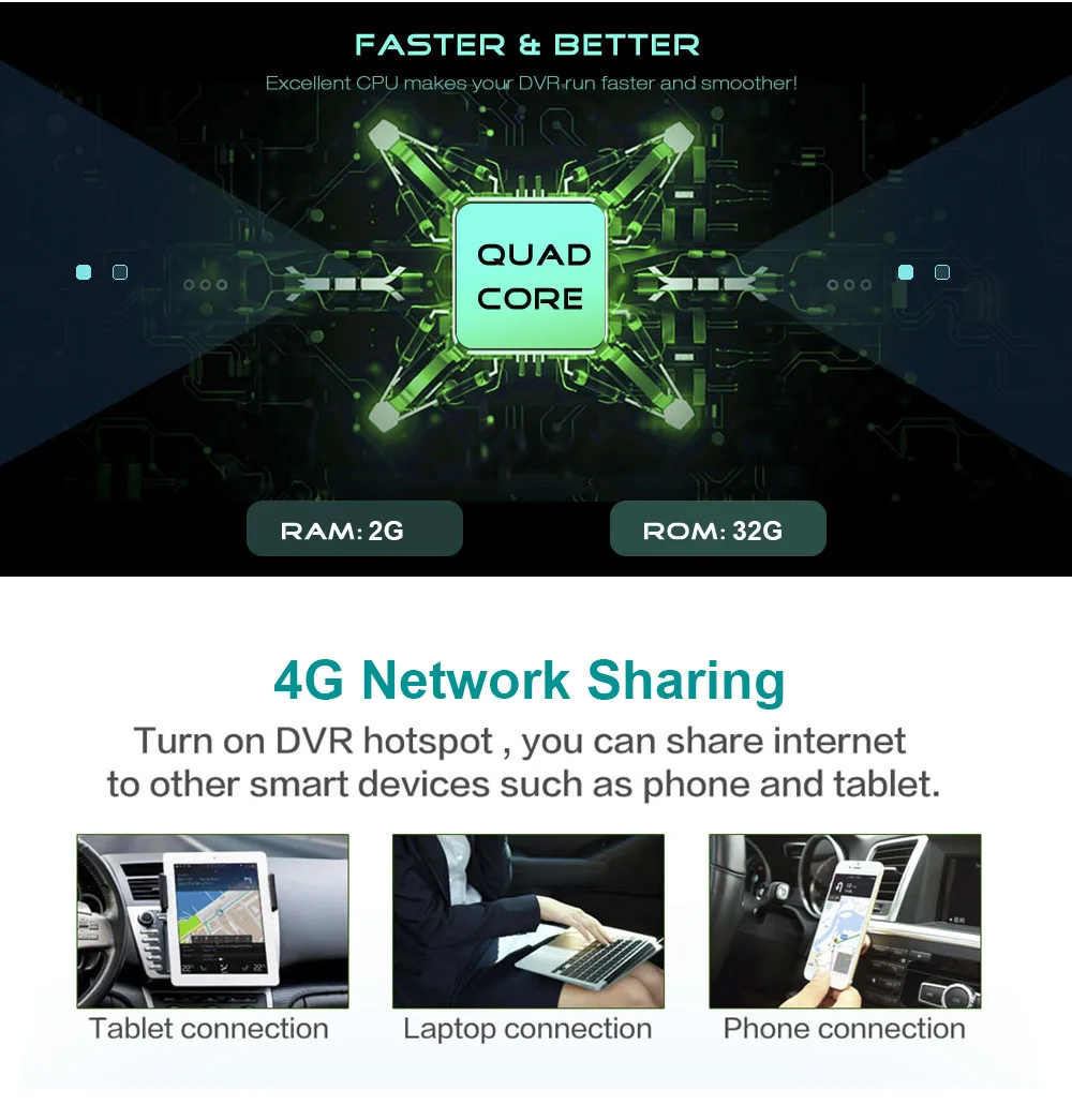 Благодаря 4G SIM-карте и встроенному wifi, где бы вы ни находились за рулем, вы получите удовольствие от интернет-серфинга, дадите возможность для онлайн-навигации/музыки/фильма и т. Д.