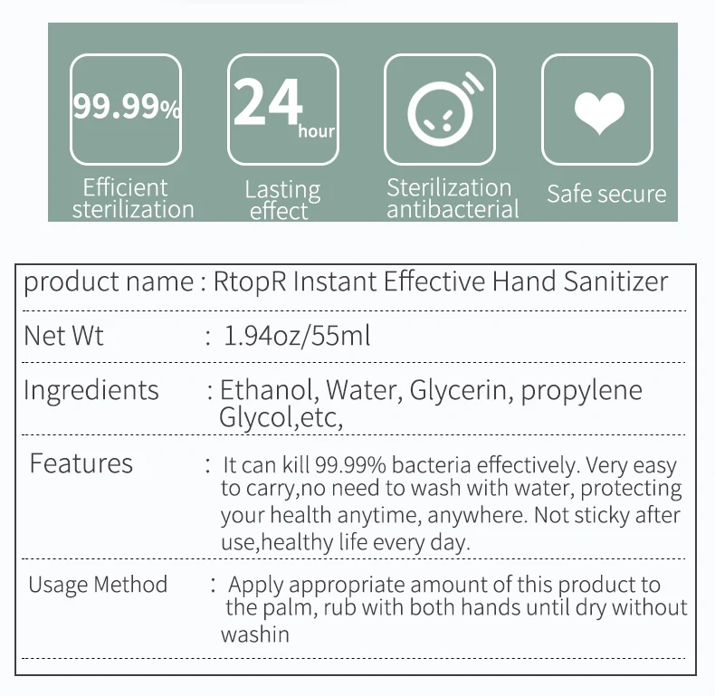1. Эффективно уничтожает 99.99% бактерий. (Staphylococcus aureus, escherichiacoil,Candida,albicans и т. Д.) 2. Очень легко носить с собой, не нужно мыть водой, защищая ваше здоровье в любое время и в любом месте 3. Не липкая после использования, здоровая жизнь каждый день.