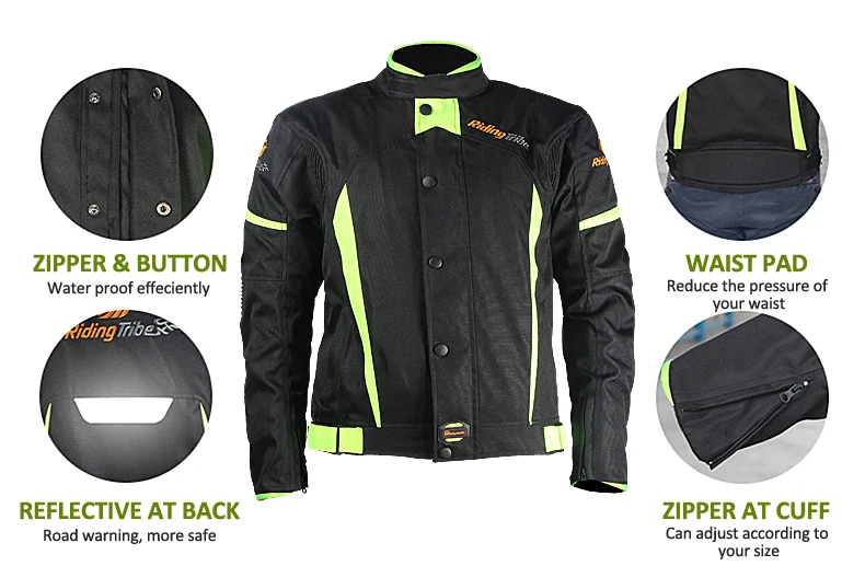 Съемные, из ЭВА защитное снаряжение, обеспечение безопасности при езде Зеленые части из флуоресцентной ткани 300D, суперотражающие, безопасные для езды Двойная верхняя конструкция, более устойчивая Блокировка попадания воды в шов на молнии Регулируемые манжеты на молнии, удобные и практичные Подол с двумя сторонами с крючком и петлей Регулировка натяжения. Дизайн в виде локтя, соответствует естественной кривизне рук, вариант типа более совершенный Поддержка талии, дизайн пояса, с талией на спине, уменьшает давление на талию. Удобная и эффективная куртка и брюки на молнии Материал: 100% полиэстер, светоотражающая ткань, лайкра, Полиэстеровая сетка, сетка, Оксфорд Летний стиль: внешняя дышащая сетка, встроенная Съемная Водонепроницаемая подкладка. Зимний стиль: внешняя водонепроницаемая ткань Оксфорд, встроенная съемная теплая подкладка.