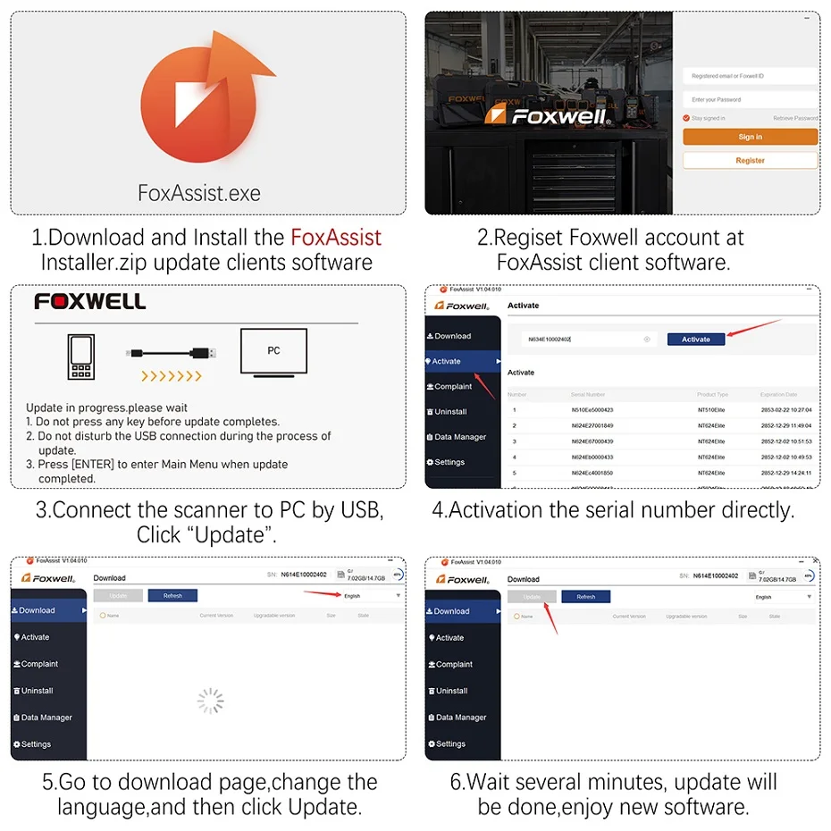 1. Перейдите на официальный веб-сайт Foxwell: Выберите свой продукт, нажмите на страницу загрузки, а затем Загрузите программное обеспечение FoxAssist Installer.zip update для клиентов. 2. Зарегистрируйте учетную запись foxwell и заполните соответствующую информацию в FoxAssist клиентском программном обеспечении. 3. Подключите NT634 к компьютеру через USB, нажмите «Обновить» меню. 4. Он может индентифицировать ваш номер sn автоматически, выберите номер sn и нажмите активацию 5. Перейдите на страницу «скачать», выберите все программное обеспечение, а затем нажмите «Обновить» 6. Подождите несколько минут, обновление будет сделано, наслаждайтесь новым программным обеспечением