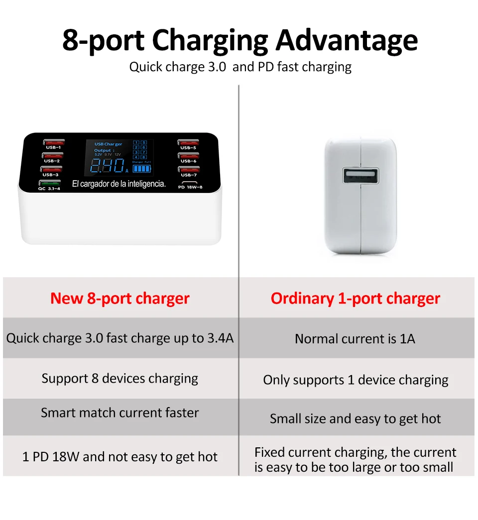 Название: 8 портов USB/Type-C/QC3.0 с дисплеем smart charger Материал: PC + ABS огнестойкий Цвет: белый ЖК-дисплей: Отображение напряжения и тока Входное напряжение: 100-240 В переменного тока Входная частота: 50-60 Гц Выходное напряжение: 5 В Выход ток: 8A Выходная мощность: 60 Вт Выходное напряжение QC3.0: 5 В/9 В/12 В Выходная мощность QC3.0: 3.4A/2.3A/1.5A Эффективность работы: 70% Выходная мощность PD: 5V3A/9V2A/12V1.5A Метод рассеивания тепла: безопасный теплоотвод алюминиевый лист Автоматическая идентификация: Автоматическая идентификация напряжения и тока в соответствии с оборудованием Размер: 128*58*49 мм