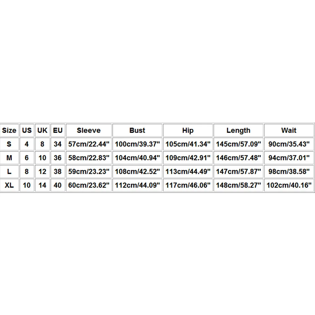 Размеры Свяжитесь с нами Великобритания ЕС Рукава Обхват груди Обхват бедер Длина Ждать S 4 8 34 57 см/22,44'' 100 см/39,37'' 105 см/41,34'' 145 см/57,09'' 90 см/35,43'' М 6 10 36 58 см/22,83'' 104 см/40,94'' 109 см/42,91'' 146 см/57,48'' 94 см/37,01'' L 8 12 38 59 см/23,23'' 108 см/42,52'' 113 см/44,49'' 147 см/57,87'' 98 см/38,58'' XL 10 14 40 60 см/23,62'' 112 см/44,09'' 117 см/46,06'' 148 см/58,27'' 102 см/40,16''