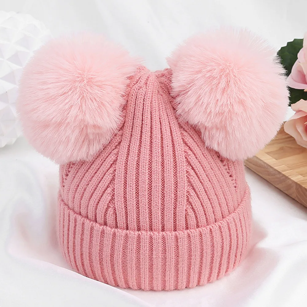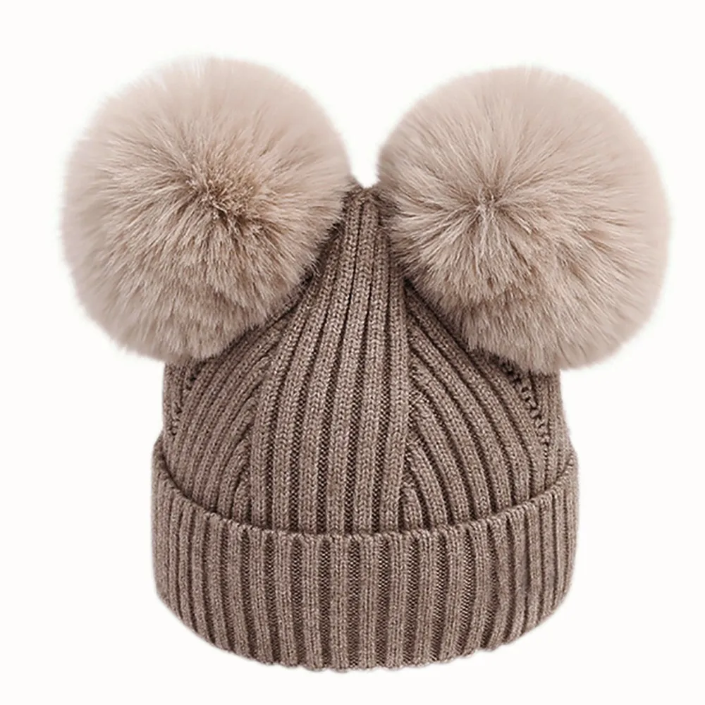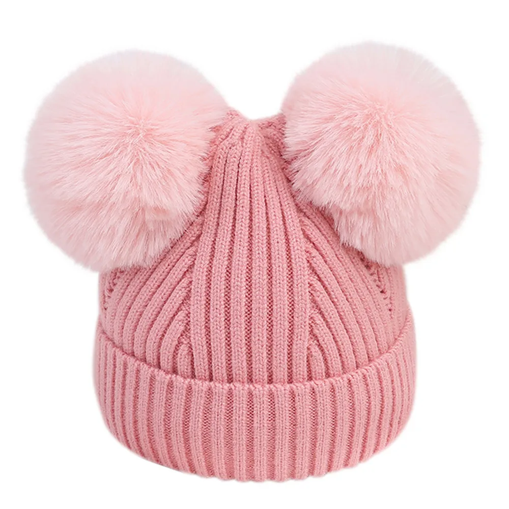 Детская Зимняя шерстяная шапка для новорожденных, вязаная шапочка с двумя помпонами, милая шапочка для мальчиков и девочек 1-3 лет