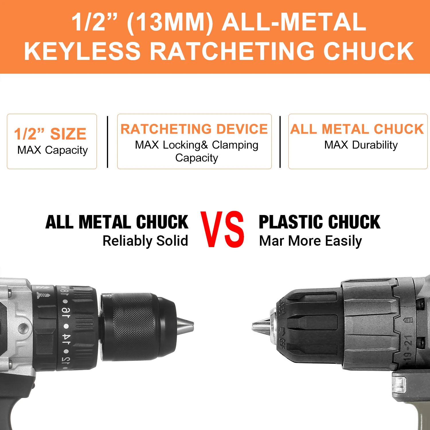 1/2in цельнометаллический БЕСКЛЮЧЕВОЙ патрон и светодиодный рабочий светильник-по сравнению с 3/8in пластиковым патроном, 1/2 дюйма Автоматическая блокировка бесключевого металлического зажимного патрона является более стабильной и не отпадает и обеспечивает максимальную совместимость и долговечность аксессуаров. Светодиодный светильник, активированный триггером, для увеличения видимости в закрытых рабочих помещениях и в темной среде.