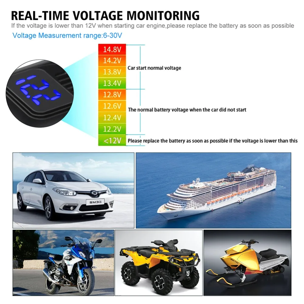 Описание: * 1. Несколько функций защиты * 2. Чип внутренней защиты высокой температуры * 3. Защита от короткого замыкания * 4. Обратная защита * 5.100% новый и высокое качество * 6. Тип товара: зарядное устройство SAE для мотоцикла с двумя usb-портами, светодиодный вольтметр и выключатель. Характеристики: * Тип товара: мотоцикл SAE на двойной QC 3,0 USB зарядное устройство вольтметр * Материал: пластик + металл * Цвет изделия: черный * Вольтметр Индикатор Светильник Цвет: синий, красный * Диапазон обнаружения напряжения: 6-30 В постоянного тока * Входное напряжение: 12 В постоянного тока * Выход USB: DC 5V3.4A/9V2.5A/12V2A * Размеры: 6.7x3.3x3cm * SAE длина кабеля питания: 98 см Посылка включает в себя: 1 комплект SAE для Dual QC3.0 USB зарядное устройство с вольтметром и выключателем Примечание: Настоящий цвет товара может незначительно отличаться от изображений на веб-сайте из-за таких факторов, как яркость монитора, яркость освещения и т. д.
