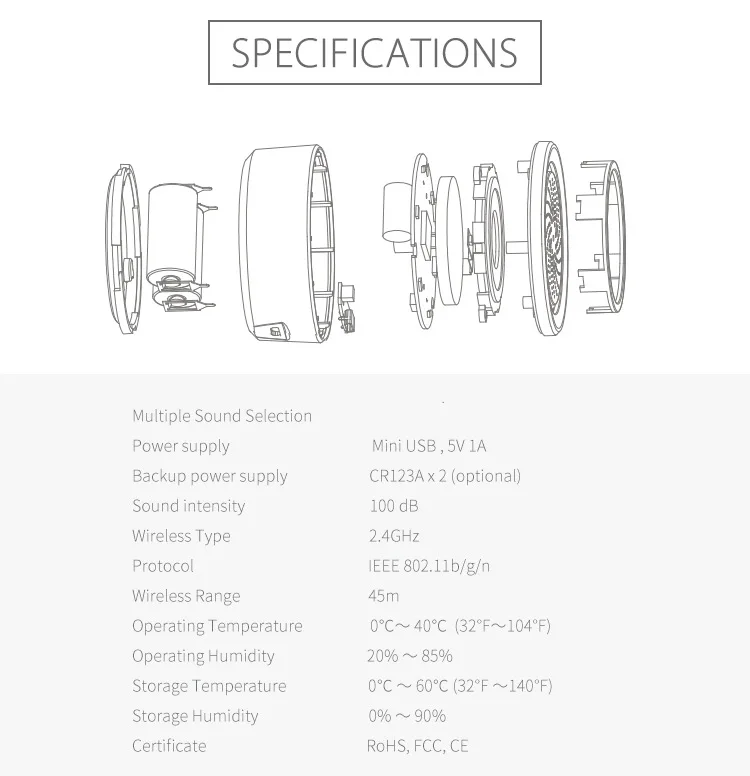 Описание: 【APP дистанционное управление и Голосовое управление 】независимо от того, как далеко от дома, тепло дома находится в руках. Делает ваш дом умнее. Совместимость с Amazon Alexa и Google Home IFTTT для голосового управления. 【Сирена с датчиком температуры и влажности 3в1 приложение устанавливает диапазон температуры и влажности заранее, обнаруживает изменения температуры окружающей среды и влажности, превышает интервал безопасности и автоматически сигнализирует даже при отсутствии сети. 【 Громкая Сигнализация 100 дБ и 18 мелодий звонка 】когда срабатывает сирена, она будет оповещать как с голосовыми подсказками 100 дБ, так и с быстрым стробоскопическим сигналом. 18 звуковых мелодий будильника по желанию, с красочной жизнью. 【 2.4GH WiFi One-key Connect Easy Setup】 не нужен домашний шлюз, вы можете легко достичь интеллектуального управления бытовой техникой, простой в эксплуатации, простой в использовании. 【Dual Power Supplys & Linking Function】 Питание осуществляется через прилагаемый usb-кабель или резервный аккумулятор (не входит в комплект). Помогает сохранить безопасность вашего дома, даже если электричество не работает. Он может связываться с другими продуктами smarthome, такими как датчики PIR или дверные датчики и т. д. Технические характеристики: Материал: АБС-пластик Цвет: белый Беспроводной диапазон: 45 м Интенсивность звука: 100 дБ Источник питания: Mini USB , 5V-1A Резервный источник питания: CR123A x 2 (не входит в комплект) Беспроводной Тип: 2.4GH, 1T1R Протокол: IEEE 802.11b/g/n Рабочая температура: 0 ℃ ~ 40 ℃ (32 °F ~ 104 °F) Рабочая влажность: 20% ~ 85% Температура хранения: 0 ℃ ~ 60 ℃ (32 °F ~ 140 °F) Влажность хранения: 0% ~ 90% Бесплатное приложение: Tuyasmart или Smart Life. Системы поддержки: Android и IOS. Размер продукта (Д * Ш * В): 65*65*30 мм/2,6*2,6 * 1.2in Вес: 100 г/3,5 унции Размер посылка: 100*100*60 мм/3,9*3,9 * 2.4in Посылка Вес: 115 г/4,1 унции Посылка список: Сирена-1 шт. (батарея в комплект не входит) USB кабель (1 шт.);
