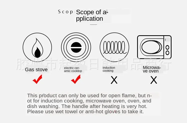 Меры предосторожности: электромагнитная печь, микроволновая печь и посудомоечная машина для открытого огня не могут быть использованы, и проволочный шарик не может быть использован для стирки. Может использоваться общая индукционная плита и открытый огонь. Пожалуйста, проконсультируйтесь со службой поддержки клиентов для получения подробной информации --