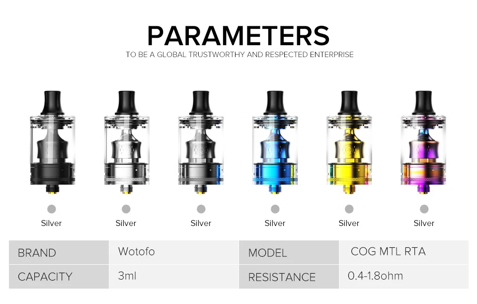Wotofo COG MTL RTA-это сотрудничество между SOCK My Mod и Wotofo. Он имеет диаметр колоды 22 мм и Компактный изысканный внешний вид. Замечательная Шестерня предназначена для пользователей MTL с простой установкой катушки и быстрым зажимом для крепления катушки. И Cog MTL RTA имеет инновационный дизайн воздушного потока с использованием редукторной системы воздушного потока, которая позволяет точно набрать в вашем потоке воздуха. Поток воздуха регулируется прямо под катушкой, создавая более точный MTL draw. 5-уровневая для регулировки воздушного потока для того чтобы обеспечить более точной настройки опыту, чем когда-либо прежде.