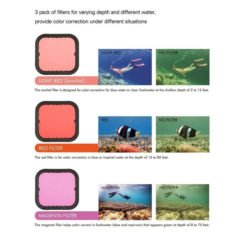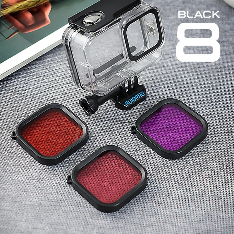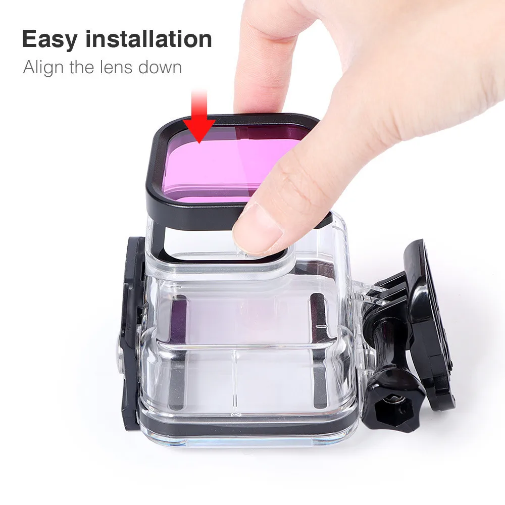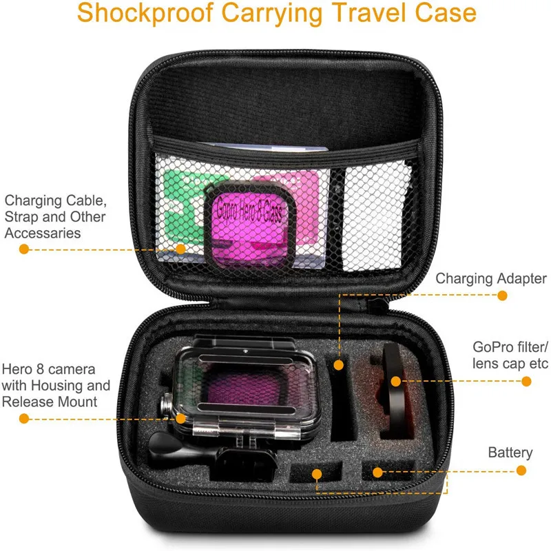 Waterproof case: Easy to install. The updated lens size design eliminates the need to remove the protective cover before placing the camera in the Gopro hero 8 waterproof case. Screen and lens protectors film: The lens kit comes with a set of screen and lens protection tempered glass membranes to protect your camera screen and lens from scratches or any accidental damage. 3 submersible filters: Correct color deviation, easy disassembly Sponge Foam Case: Reduce wind noise to enhance audio capture performance 12pc anti-fog insert: Prevents the camera lens from fogging in cold and humid environments inside the Gopro housing. Shockproof suitcase: The internal foam is used to fix the accessories and prevent collisions. The mesh cover on the cover can store small accessories such as lens caps, film or cable.
