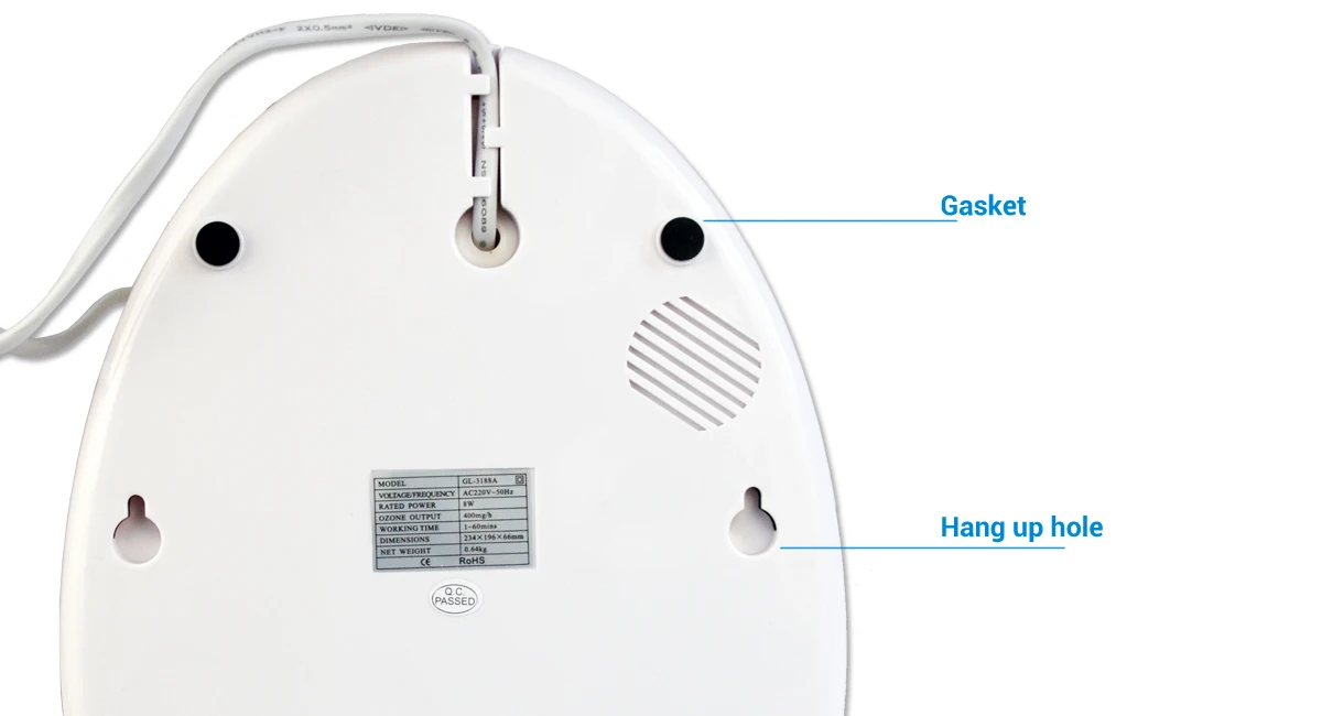 * Выход озона: 400 мг/ч * Мощность питания: 220VAC 50/60Hz * Потребляемая мощность: 8 Вт * Настройка таймера: 5,10,15,20,25,30 мин * Размер: 270x190x75 мм * Вес: 0,8 сом
