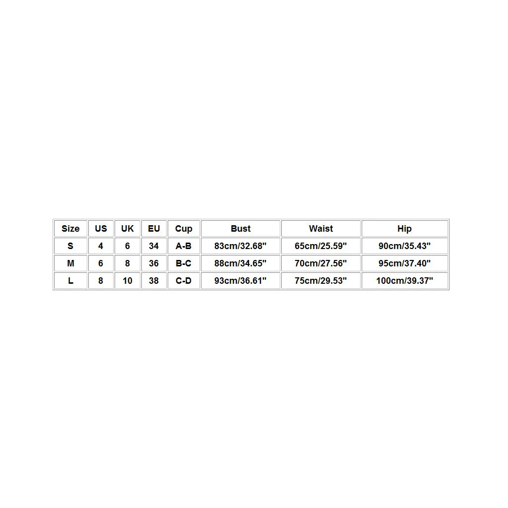 Размер США Великобритания ЕС Чашка Бюст Талия Бедра S 4 6 34 A-B 83 см/32,68'' 65 см/25,59'' 90 см/35,43'' М 6 8 36 B-C 88 см/34,65'' 70 см/27,56'' 95 см/37,40'' L 8 10 38 C-D 93 см/36,61'' 75 см/29,53'' 100 см/39,37''