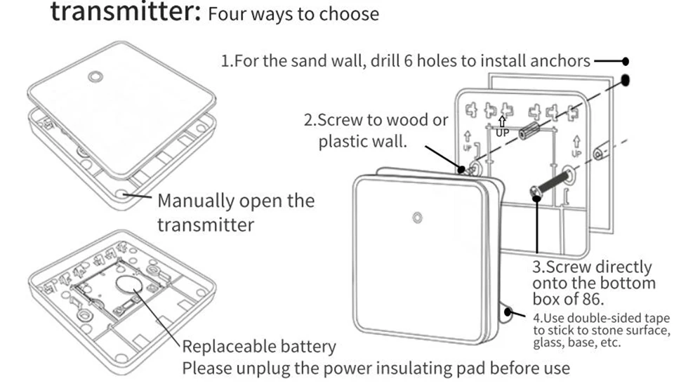 5. В передатчике используется щелочная батарея CR2032 (батарея в комплект не входит).