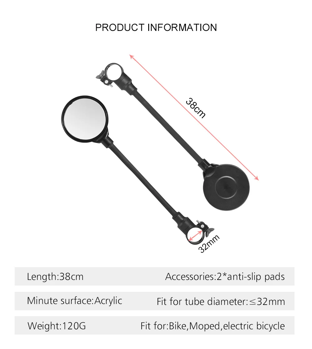 Стиль: 360 ° регулируемый, акриловый велосипед зеркало Вес: около 120 г Длина: около 38 мм Аксессуары: 2 * Противоскользящие прокладки Материал: Зеркальная поверхность: акрил, Материал корпуса: АБС, Зеркальный столб: Резина + пластик, алюминиевый стержень