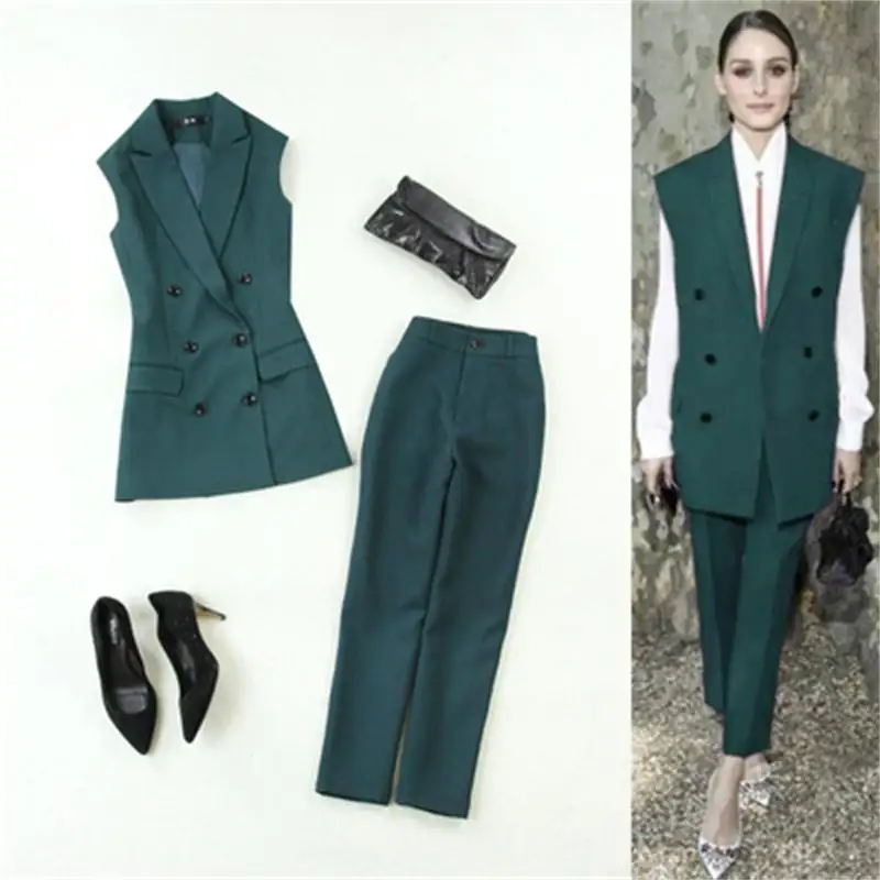 Новинка, Женский весенне-летний костюм больших размеров, темно-зеленый костюм с воротником, жилет, прямые брюки, офисный костюм