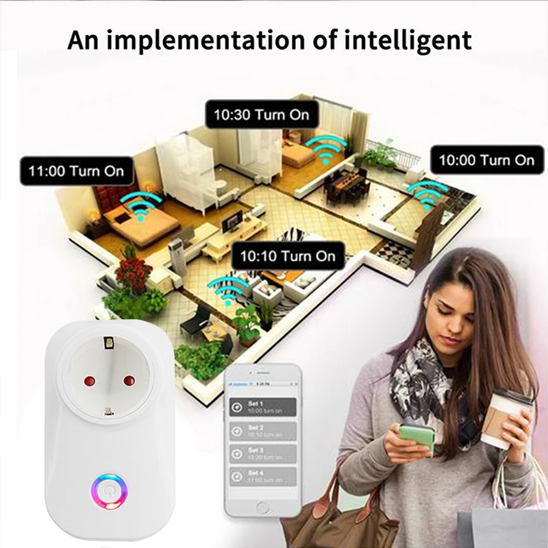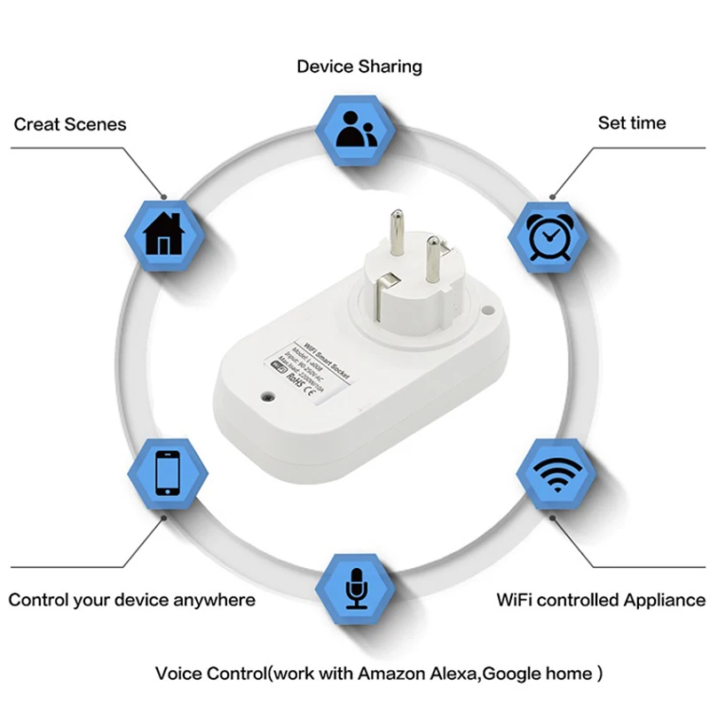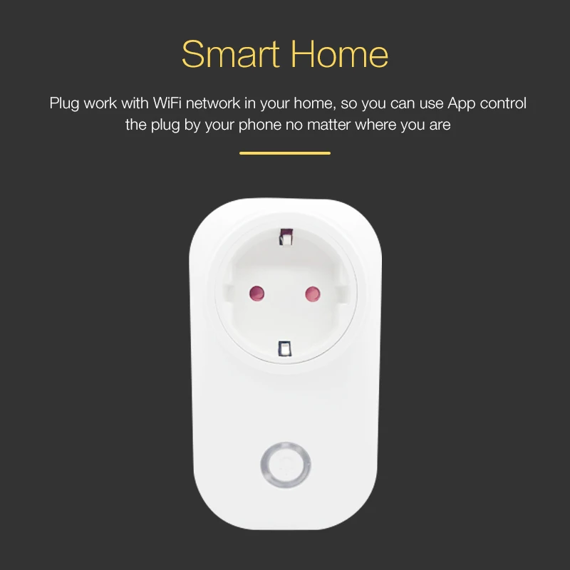 MODEL: WiFi EU Smart Plug Remote control appliance power ON/OFF via App Timing function. Wireless Type: WiFi 2.4GHz 802.11b/g/n Wifi distance:45m Free app:Tuyasmart or Smart Life. Support systems: Android and IOS. Workes with Alexa Echo and google home. Rated Voltage: AC 100-240V 50/60Hz Rated Current: 16A Working Temp:-20℃~50℃ Working Humidity:≤80% Shell Material:PC+ABS Certification: CE/FCC/ROSH