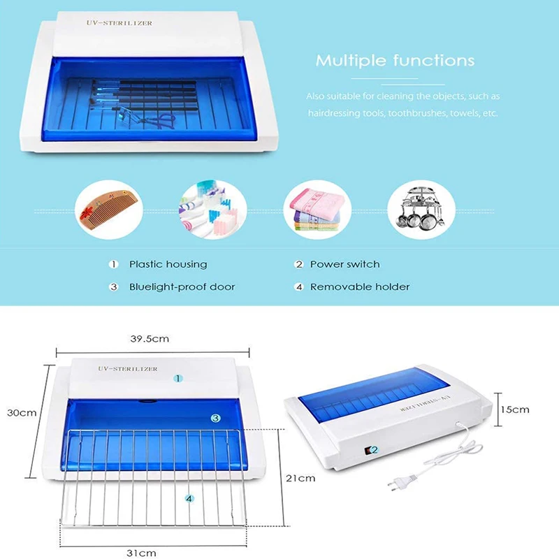 Хост излучает два волны: светильник 254нм и 185нм. 254нм уничтожит бактерии и уничтожит бактерии. 185нм может изменить кислород в воздухе в озон, который обладает сильным окисляющим свойством и может убить бактерии. Этот шкаф для дезинфекции ногтей стерилизован ультрафиолетовым озоном по сравнению с традиционной стерилизацией при высокой температуре, более безопасной и тщательной. Он изготовлен из высококачественного АБС-материала, который является термостойким и антивозрастным, продлевая срок службы продукта.