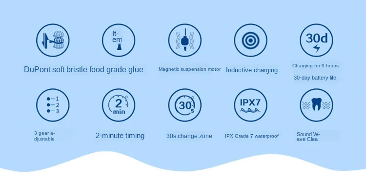 2: напоминание о мощности: когда мощность составляет менее 10%, зубная щетка автоматически выключается после того, как индикатор питания начнет мигать 5 раз после включения. Когда мощность меньше 20%, индикатор будет мигать после включения, пожалуйста, заряжайте вовремя.