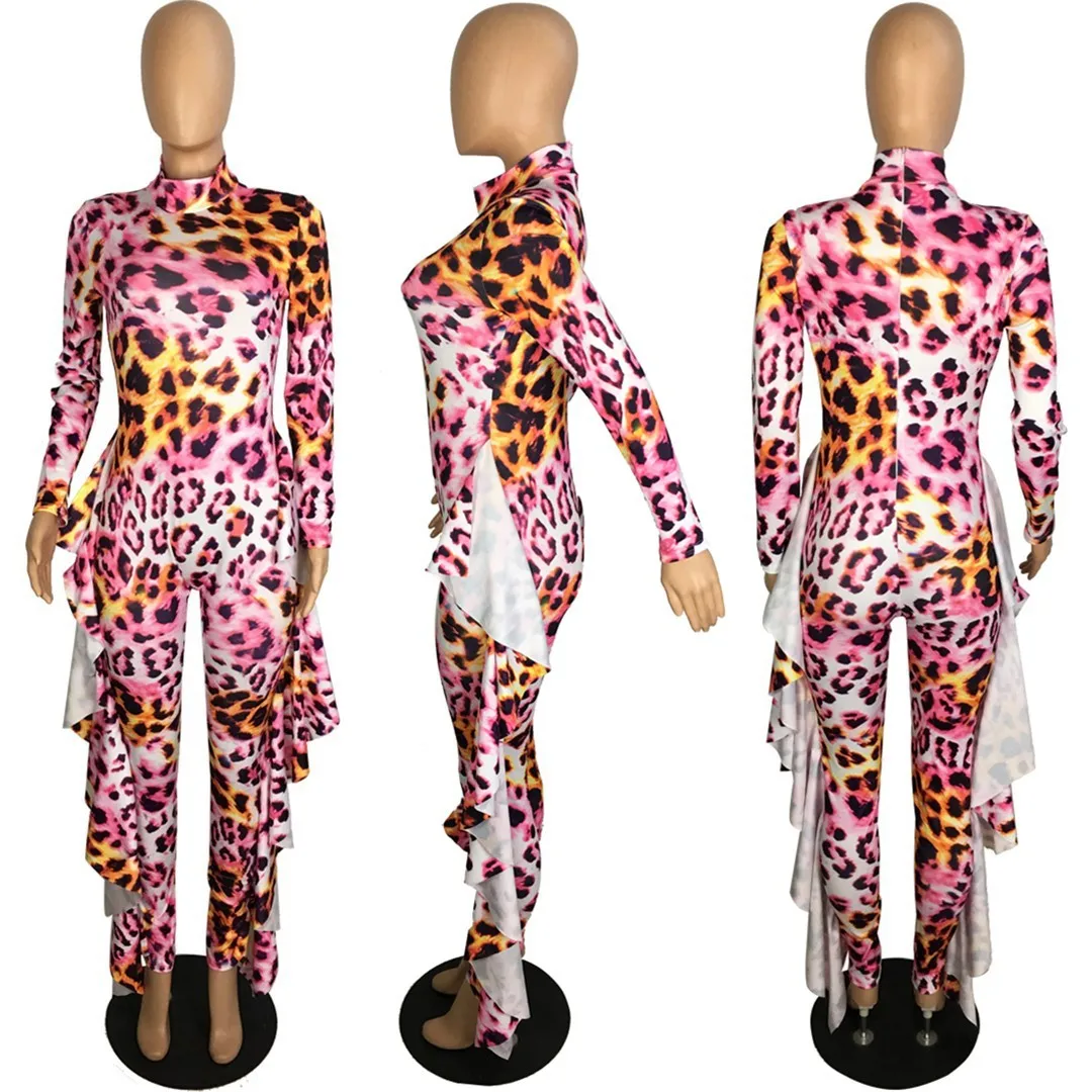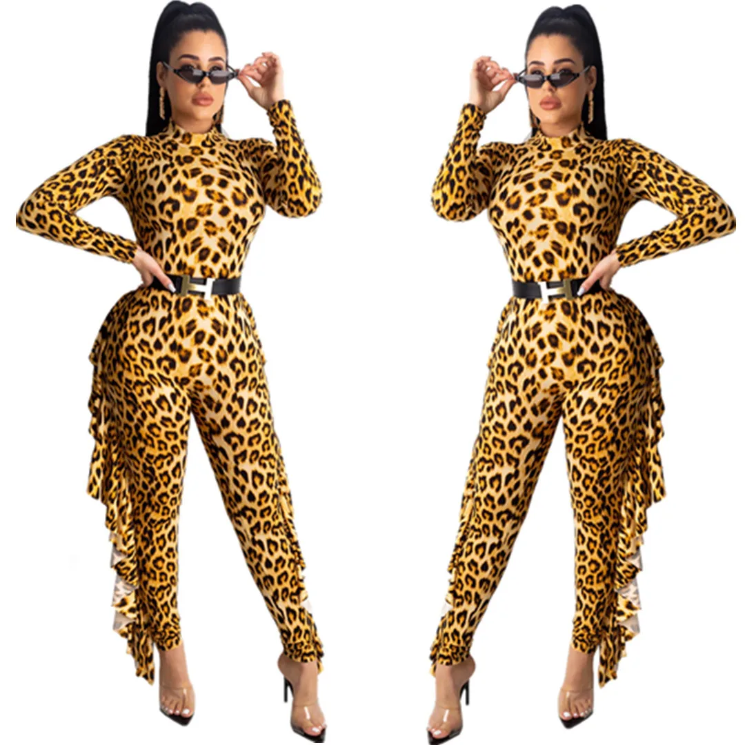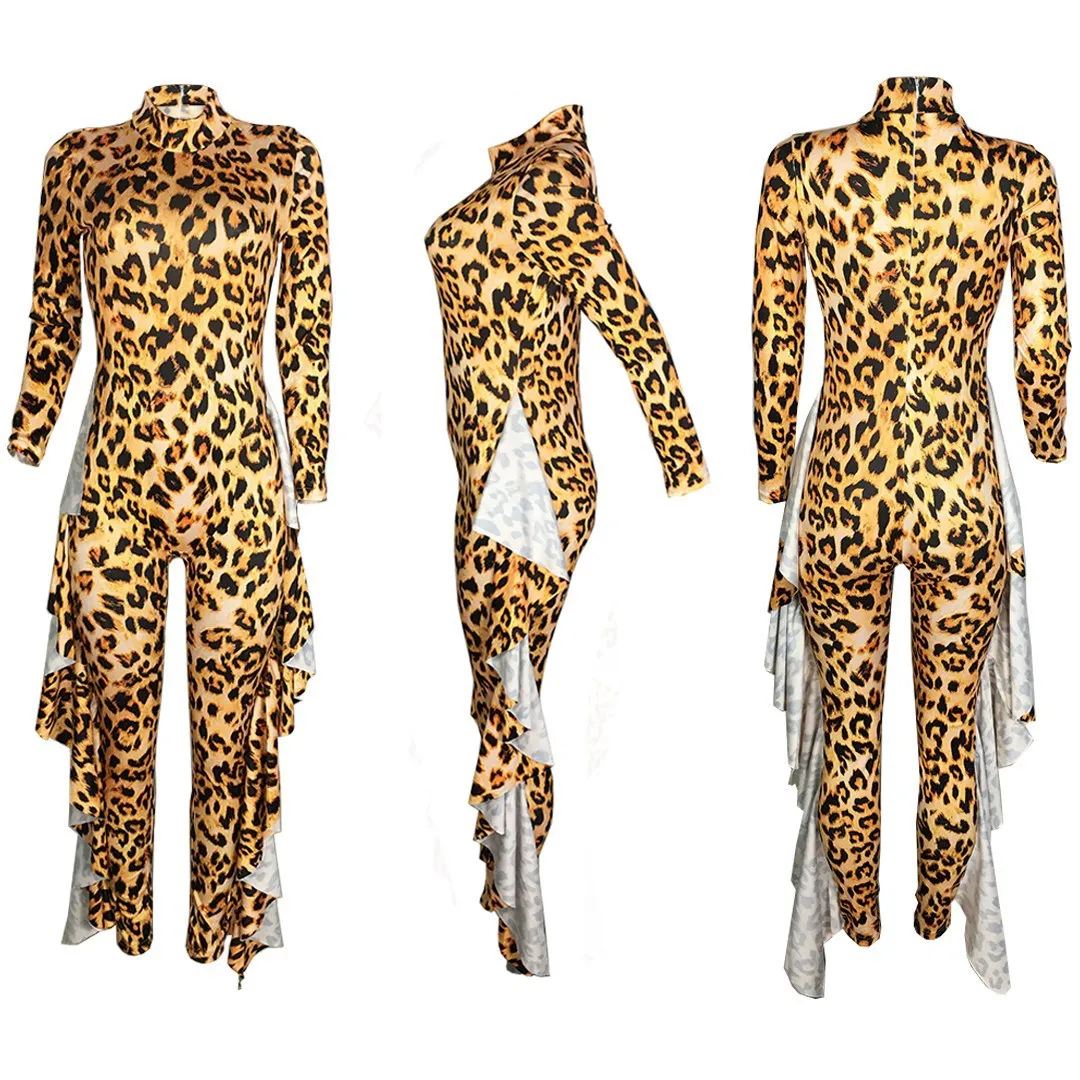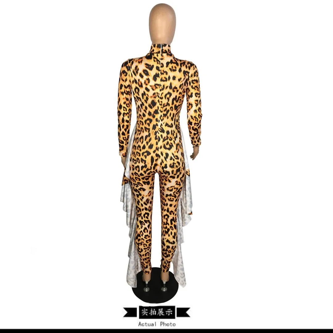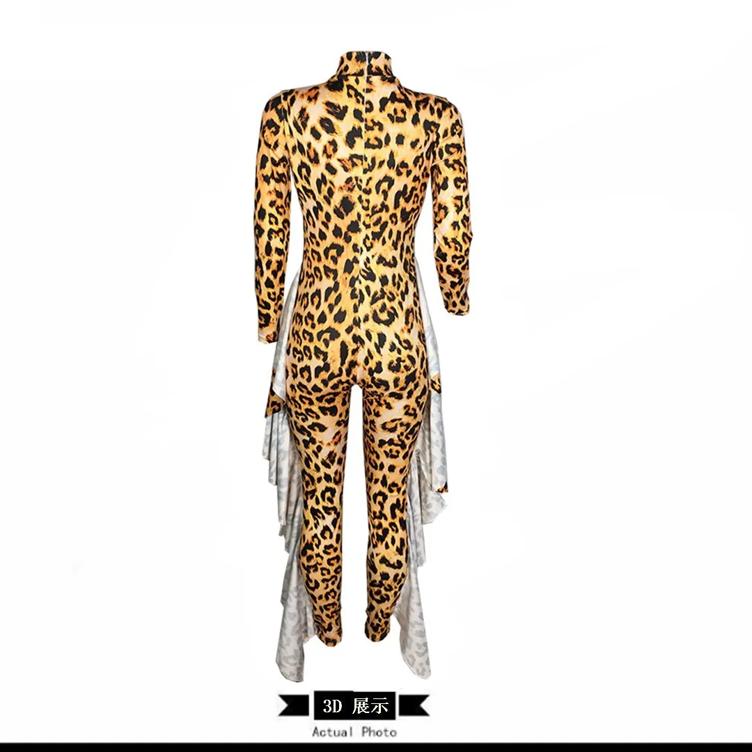 Женский комбинезон с леопардовым принтом и оборками, повседневный Облегающий комбинезон с высоким воротником и длинным рукавом, вечерний комбинезон для ночного клуба