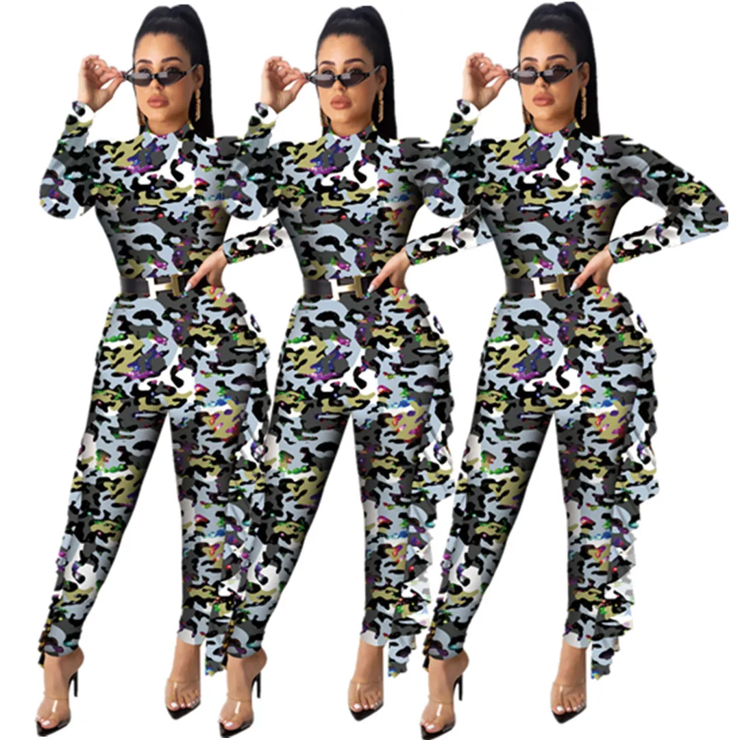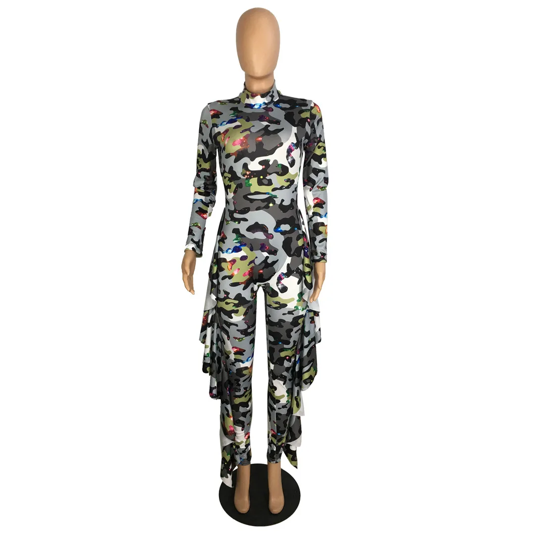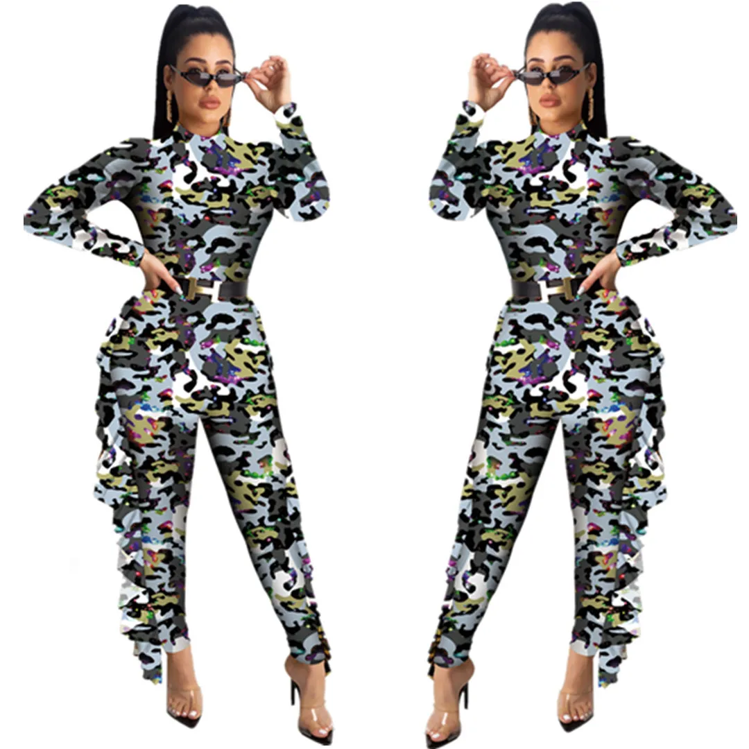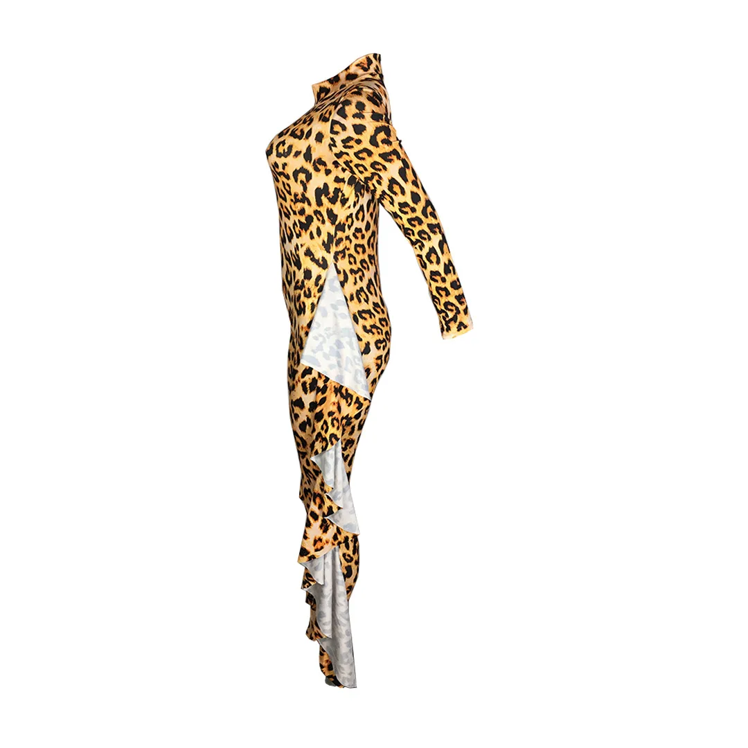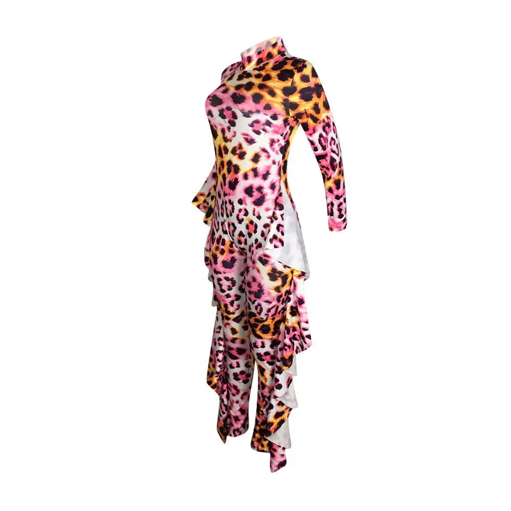Женский комбинезон с леопардовым принтом и оборками, повседневный Облегающий комбинезон с высоким воротником и длинным рукавом, вечерний комбинезон для ночного клуба