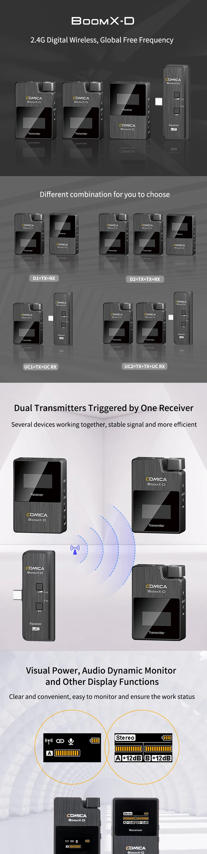 Comica Boom X-D 2,4G цифровой 1-Trigger-2 беспроводной микрофон Основные Особенности:. 2,4G Цифровая беспроводная, Глобальная свободная частота. Два передатчика, срабатывающие одним приемником. Визуальная мощность, аудио динамический монитор и другие Дисплей функции . Внутренний и внешний микрофон два входных режима . Моно/стерео переключаемые режимы вывода . Аудио монитор в реальном времени . Вещания качество звука . Технология RF, Auto Freq. Настройка, стабильный Коробка передач . Низкая задержка <20 мс . Рабочий диапазон до 50 м . Разработан с многофункциональным зажимом для ремня и компактным Упаковочный лист Основные Запчасти: Передатчик (TX) Приемник (RX) Приемник UC (UC RX) Несколько вариантов: D1 = TX + RX D2 = TX + RX UC1 = TX + UC RX UC2 = TX + UC RX