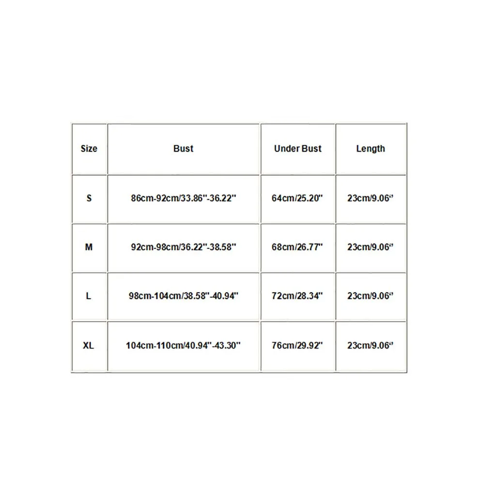 Size Bust Under Bust Length S 86cm-92cm/33.86''-36.22'' 64cm/25.20'' 23cm/9.06‘’ M 92cm-98cm/36.22''-38.58'' 68cm/26.77'' 23cm/9.06‘’ L 98cm-104cm/38.58''-40.94'' 72cm/28.34'' 23cm/9.06‘’ XL 104cm-110cm/40.94''-43.30'' 76cm/29.92'' 23cm/9.06‘’