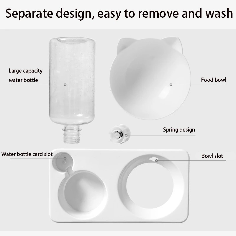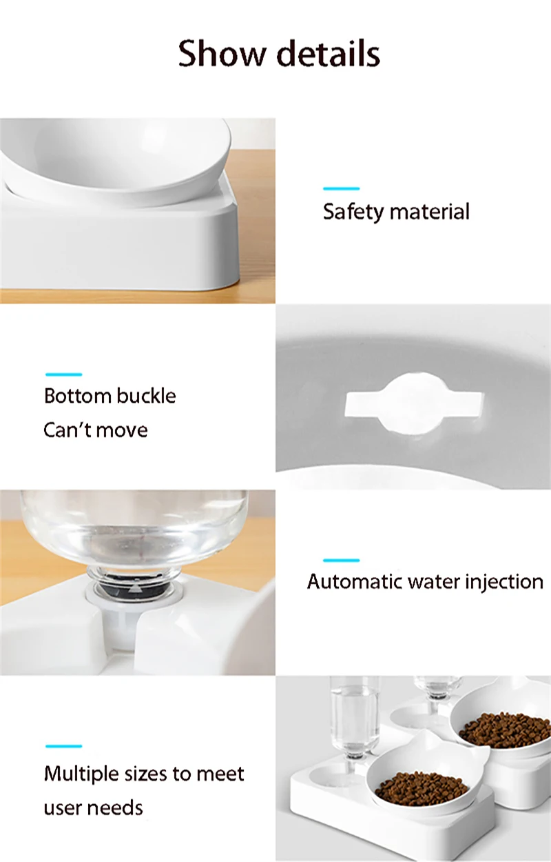 600 мл воды-это лучше всего подходит для маленьких собак и кошек. И автоматический диспенсер для воды автоматически пополняет воду в блюдо, помогает сохранить воду в заполненном состоянии и очистить, будь то дома или нет. Просто и удобно использовать сифон, чтобы автоматически пить воду. Предназначен для поднятия основания-0 ° или 15 ° с двойным углом вращения Регулируемые пищевые миски. Когда миска для кормления на 15 °, домашние животные едят на рост 7 см. Уменьшает нагрузку на позвоночник, вызванную тем, что кошки и собаки едят, что хорошо для роста и развития домашних животных. Легко мыть блюда-миски и диспенсер для воды снимаются, могут быть удалены из всего и легко моются.