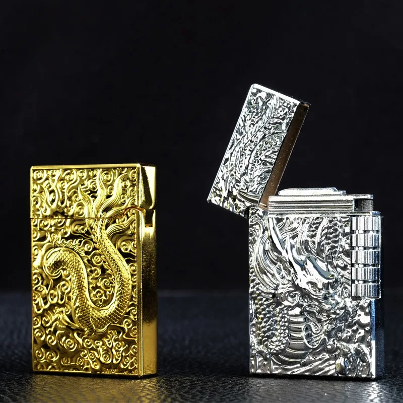 Металлическая винтажная рельефная зажигалка, шлифовальный круг, золотой дракон, свободный огонь, турбо кремн, газовая зажигалка, Бутан, ветрозащитная Зажигалка для сигарет