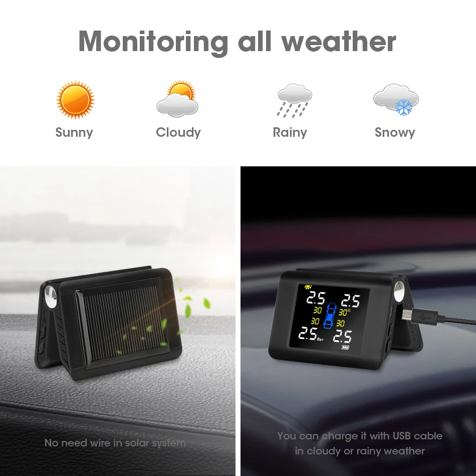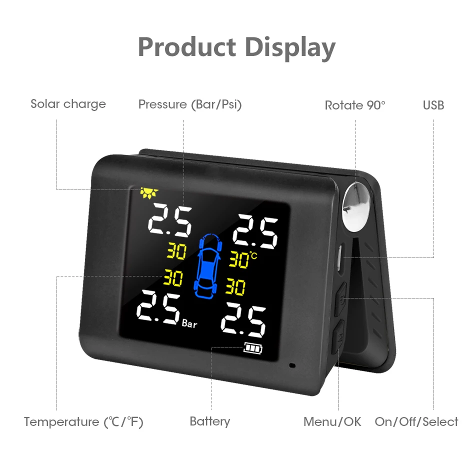 В: что такое TPMS?О: это система контроля давления в шинах, а также датчик давления в шинах. Подайте сигнал тревоги и показывайте давление и температуру автомобиля.В: сколько времени может использоваться сенсорная батарея?A: Встроенный датчик: 5 лет; Внешний датчик: 3 года. Мы предлагаем всем нашим клиентам бесплатную замену батареи, и покупателям нужно всего лишь заплатить около 3-4 $ за стоимость доставки.В: Как установить датчики?О: мы предлагаем установить Встроенные датчики профессиональным автомобильным центром; Внешняя установка может прочитать нашу страницу и руководство для справки.В: работает ли Солнечная зарядка в пасмурный день?О: Да. Как правило, полная Солнечная зарядка может работать в течение 3 дней, и она может работать в пасмурные и туманные дни.В: может ли он работать в снежный день?О: Да. Если TPMS показывает "N5 Alarm", пожалуйста, не волнуйтесь и просто Управляйте автомобилем на расстоянии, чтобы шины двигались. Все будет в порядке. На внешние датчики будет влиять холодная среда, просто нужно управлять автомобилями.В: требуется ли подключение автомобильного прикуривателя для зарядки?О: Нет. Обычно он заряжается от солнечной батареи, но если вы долгое время встречаете очень плохую погоду или вам нужна срочная зарядка, вы можете использовать USB для зарядки. (USB не входит в комплект)В: Нужно ли включать/выключать TPMS?О: Нет. Он включится При ударной загрузке и выключится, если нет удара в течение 10 минут.