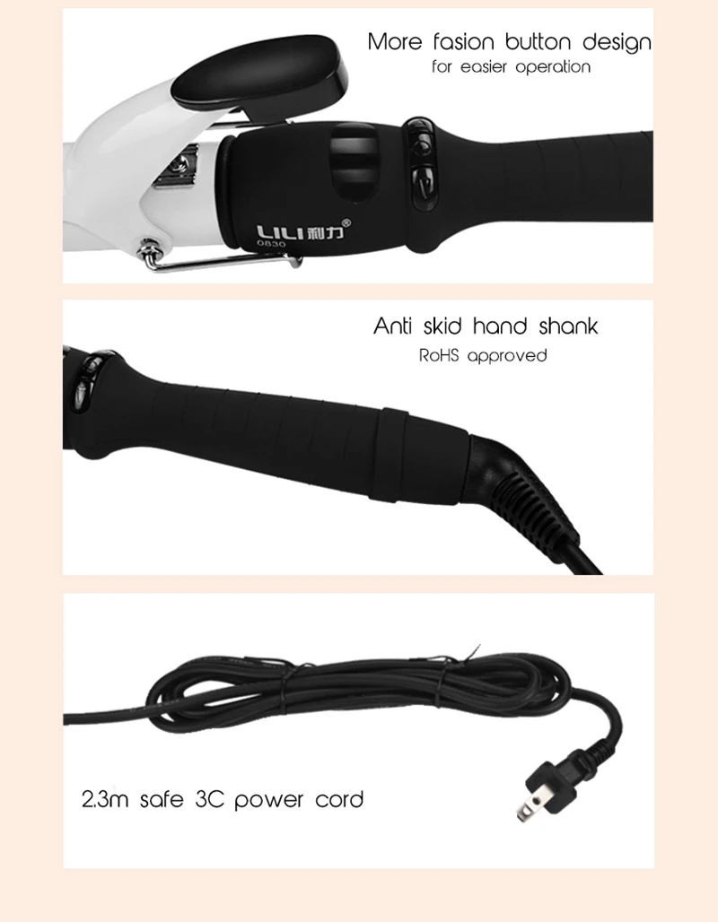 Фирменное наименование LILI Модель HS-0830 Температура ЖК-дисплей Материал теплопроводности Керамика Подходящие волосы Сухой/влажный Режим сетевого шнура Вращающийся на 360 градусов Длина кабеля 2,3 м Нагревательный элемент PTC нагреватель Использование 1 С переключателем «LOCK» «UNLOCK», прост в эксплуатации.