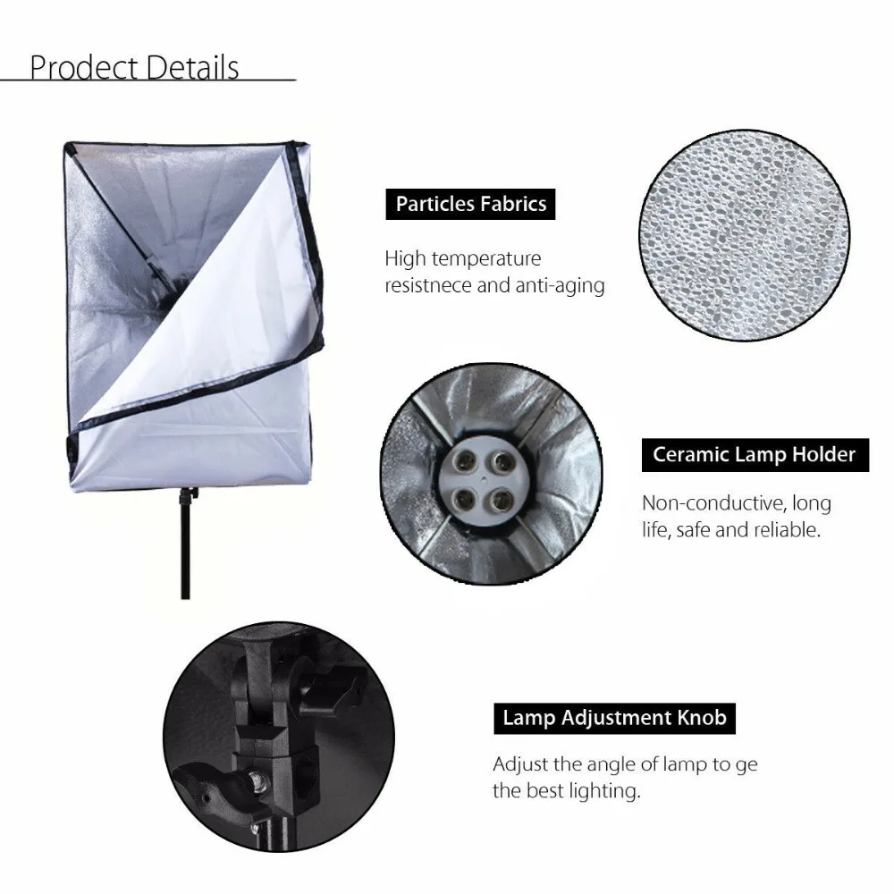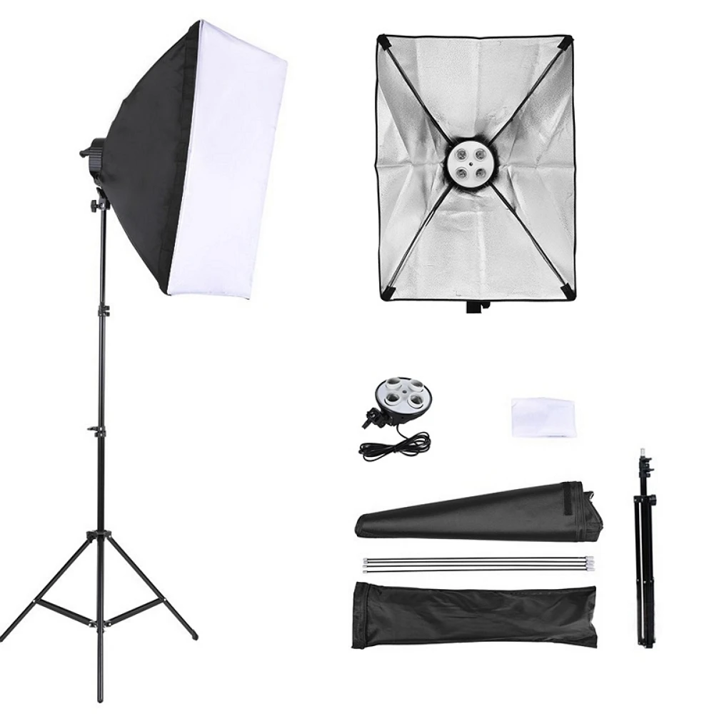 Характеристика:Это идеальный набор софтбоксов для цифрового фото-и видеосъемки.Четыре держателя лампы: Цоколь E27 подходит для большинства осветительных приборов.50x70 софтбокс: белая Складная мягкая ткань, Высококачественная Светоотражающая частица.Характеристики:Название продукта: комплект освещенияОсновной цвет: черныйСветильник Материал стойки: алюминиевый сплавРазмер софтбокса в разложенном виде: 50x70 см (Ш x В)Сложенный Софтбокс Длина: 57 смСветильник с подставкой: 75-200 смE27 4 гнезда лампыE27 4 гнезда Напряжение лампы: 220-240 ВE27 4 розетки Мощность лампы: 800 ВтПосылка включает в себя:A:2x студийный светильник для фотосъемки2x складной софтбокс с сумкой для хранения2x E27 4 гнезда лампы (не включая лампу)B:2x студийный светильник для фотосъемки2x складной софтбокс с сумкой для хранения2x E27 4 Торцевая лампаЛампа 8x135WC:2x студийный светильник для фотосъемки2xFoldable софтбокс с сумкой для хранения2xE27 4 Торцевая лампаЛампа 10x25 ВтD: