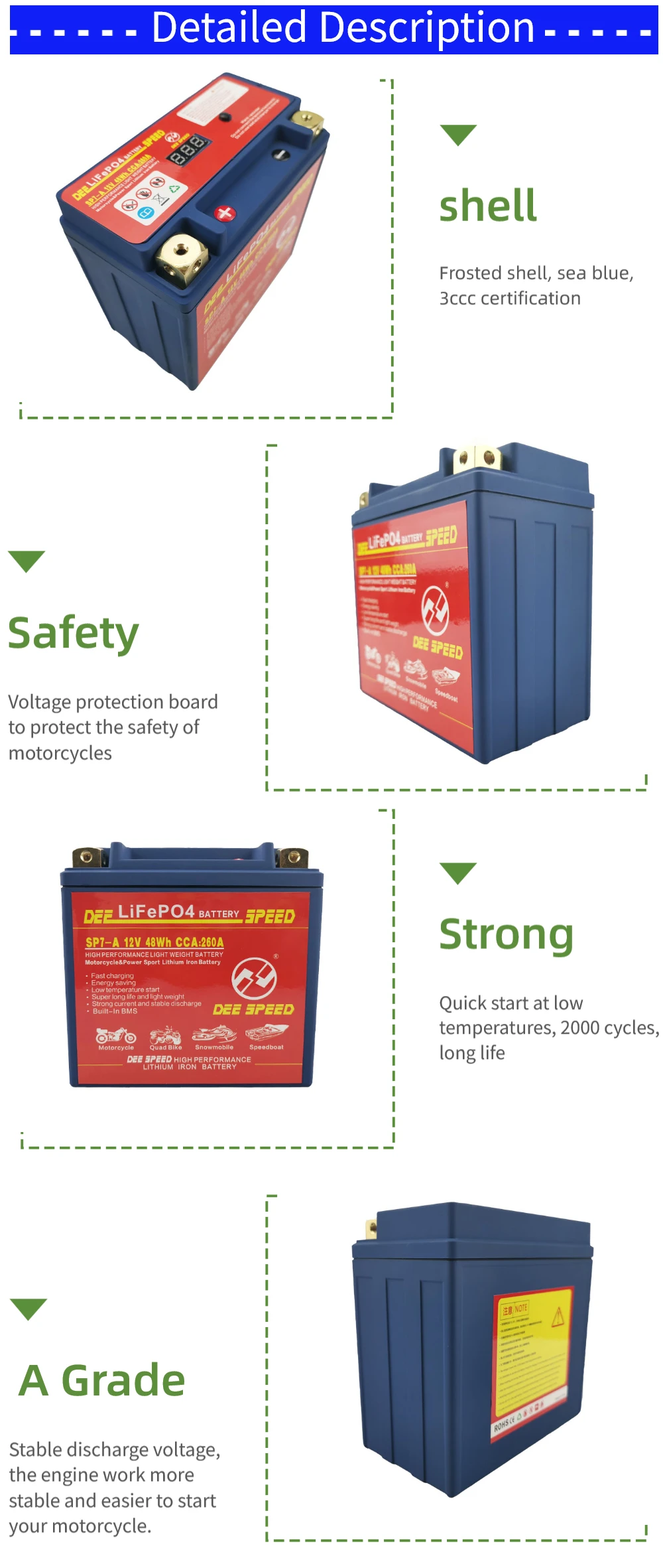 Номер модели: SP7-A SP9-B Ёмкость: 7Ah 9Ah CCA: 260A 330A Максимальное напряжение защиты: 14,6 в Конечное напряжение: 8 в Размеры: SP7-A 135*75*134 мм SP9-B 135*75*133 мм Сертификат: CE ROHS MSDS UN38.3 Высококачественные детали/аксессуары: класс А Плата защиты напряжения: Да Срок службы: более 2000 раз Максимальный ток зарядки: 10A Используется для: Для Ducati Для Suzuki для Yamaha для Honda Для Kawasaki для BMW Harley-Davidson, для KTM Spring Breeze Benali Xinyuan Triumph для Qianjiang и т. Д. Направление положительного и отрицательного электрода: L отрицательное положительное оставлено отрицательное и правое положительное, L положительное отрицательное оставлено положительное и правое отрицательное Посылка включает в себя: 1. Одна батарея стартера скорости ди 2. Одно специализированное зарядное устройство