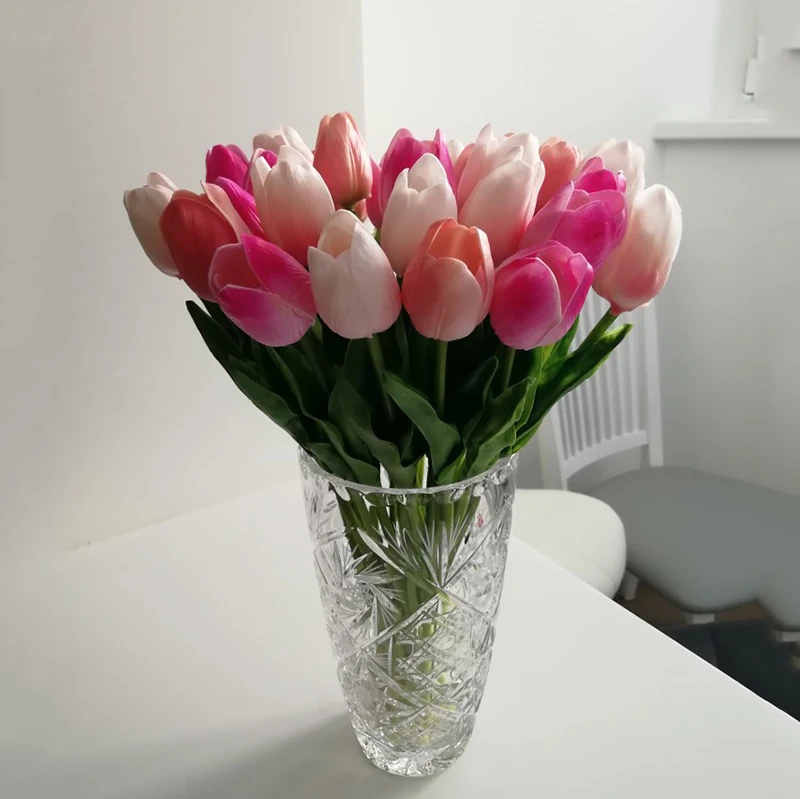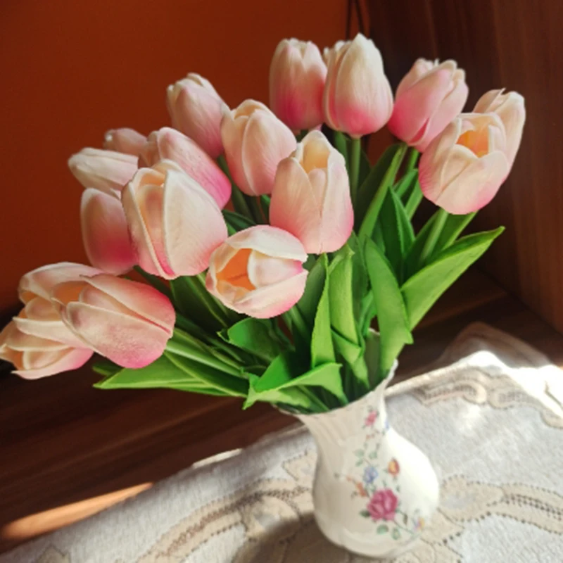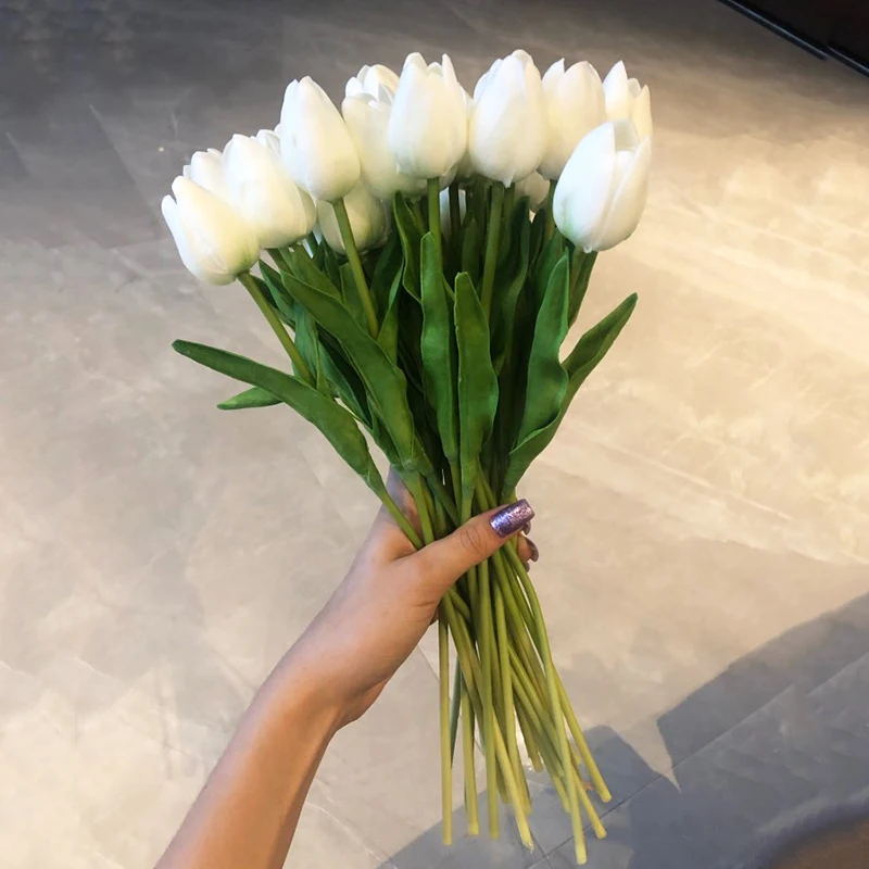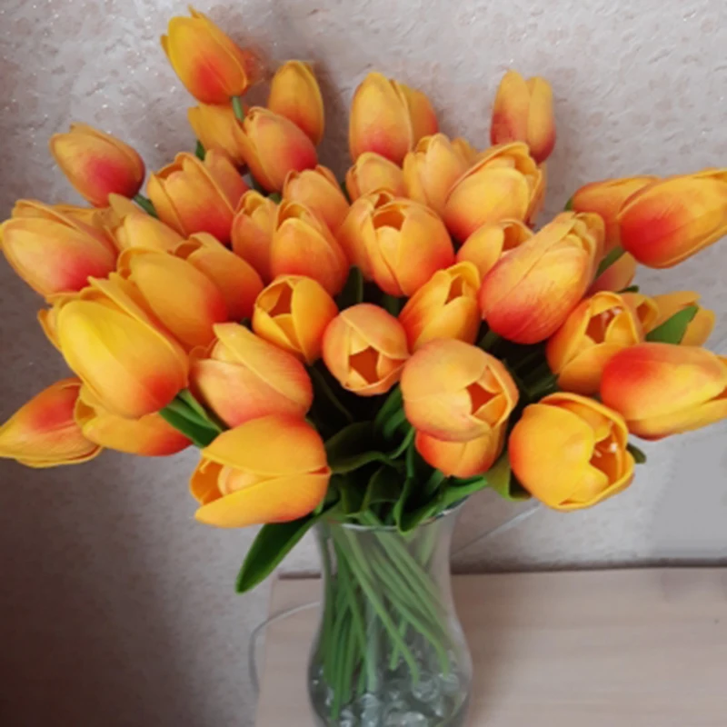Material: PU Shape: Tulips Size: Flower Leaf: about 11cm Length: about 35cm Flower diameter: About 3.5 Package included: 10pcs Artificial Tulip Flower PU Fake Flowers
